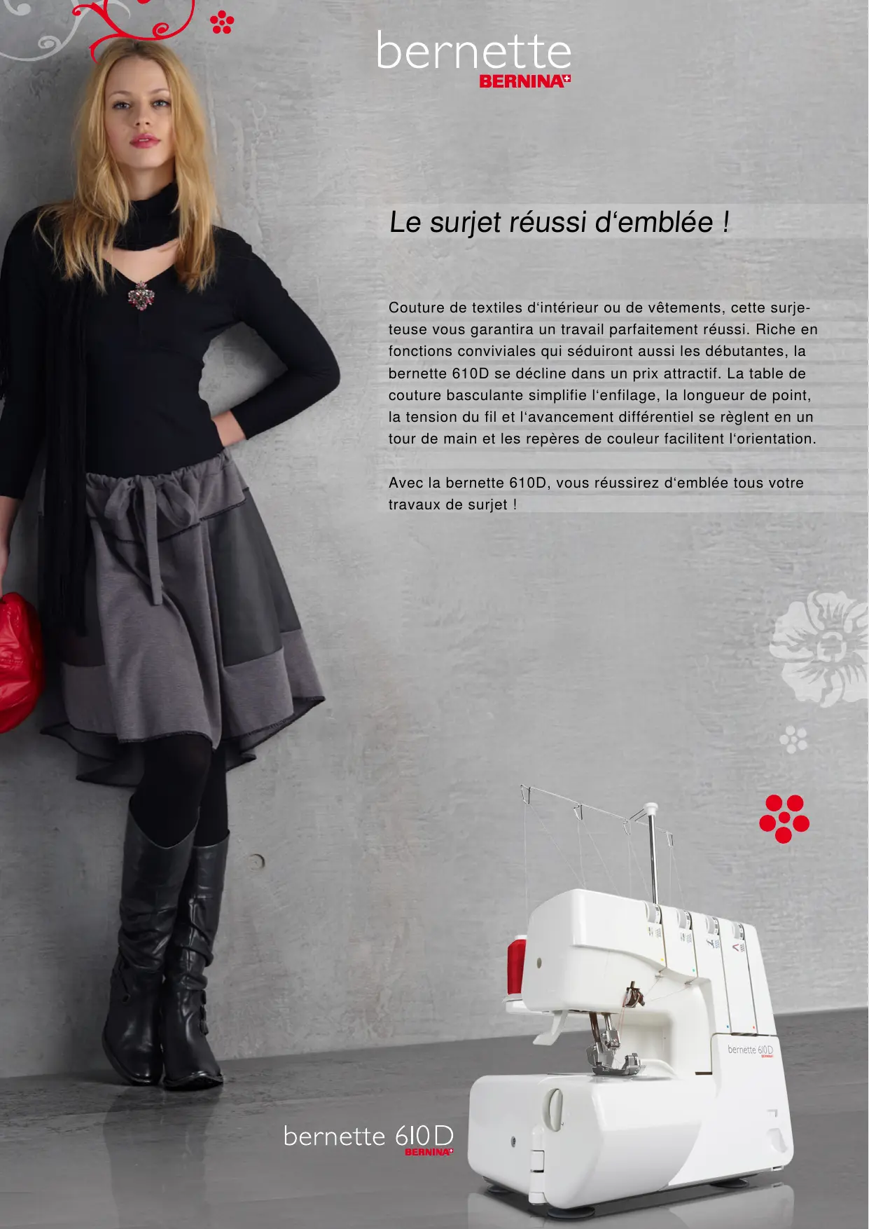 Le surjet réussi d‘emblée ! Couture de textiles d‘intérieur ou de vêtements, cette surjete use vous garantira un travail parfaitement réussi. Riche en fonctions conviviales qui séduiront aussi les débutantes, la bernette 610D se décline dans un prix attractif. La table de couture basculante simplifie l‘enfilage, la longueur de point, la tension du fil et l‘avancement différentiel se règlent en un tour de main et les repères de couleur facilitent l‘orientation. Avec la bernette 610D, vous réussirez d‘emblée tous votre travaux de surjet ! Magnifiques ourlets roulés Réglages en finesse : la bernette 610D vous permet d‘ajuster vos ourlets roulés avec une grande précision. Longueur optimisée du fil d‘entourage de rebords La languette de point échangeable permet d‘optimiser la longueur du fil d‘entourage de rebords. La fin des fils relâchés ! Surjet précis sur les tissus épais Equipée d‘un moteur puissant de 120 watts, la bernette 610D surjette sans problème tous les tissus épais comme le jean. Les coutures sont nettes et les points particulièrement réguliers. Couture à 2, 3 et 4 fils Du point plat à 2 fils pour l‘assemblage et la couture sur tissus élastiques au point de surjet à 4 fils, la bernette 610D relève tous les défis avec une qualité de point professionnelle. La fin des rebords effilochés et des tissus qui froncent ! Champ de commande dégagé Clair et précis, le champ de commande s‘accompagne de repères de couleur qui simplifient le réglage de la tension du fil. Tiges de bobines extra longues Les tiges de bobines extra longues accueillent désormais des cônes de 1000 mètres tout en garantissant un déroulement fluide et sûr des fils. Guidage intégré du tissu La bernette 610D est équipée d‘un guidage intégré du tissu qui facilite son avancement et la beauté des coutures ! Facile à retirer s‘il n‘est pas nécessaire. Avancement différentiel L‘avancement différentiel réglable en continu assure des coutures parfaitement plates sans tirer ni froncer le tissu. Il permet aussi de créer des fronces au gré de ses envies si cet effet est souhaité. Réglage simple de la largeur de couture La vis séparée située sur le côté gauche de la machine permet de régler facilement la largeur de la couture. Enfilage simple et rapide La table de la bernette 610D peut se rabattre afin de libérer de l‘espace pour l‘enfilage et les repères de couleur le facilitent. Récepteur de chutes de tissu inclus Promesse d‘ordre parfait sur la table, le récepteur de chutes de tissu livré avec la surjeteuse s‘encliquette sur le couvercle du boucleur. Accessoires dans le couvercle du boucleur La bernette 610D s‘accompagne d‘une gamme d‘accessoires pratiques qui sont rangés dans le couvercle du boucleur et donc toujours à portée de main. Accessoires en option Votre concessionnaire BERNINA vous proposera toute une gamme d‘accessoires optionnels pour la bernette 610D. Autres informations auprès de votre concessionnaire BERNINA ou sous www.bernina.com. www.bernina.com