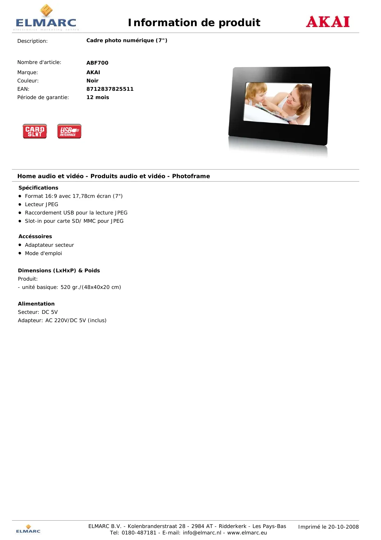 Période de garantie: 12 mois Home audio et vidéo - Produits audio et vidéo - Photoframe Spécifications Format 16:9 avec 17,78cm écran (7") Lecteur JPEG Raccordement USB pour la lecture JPEG Slot-in pour carte SD/ MMC pour JPEG Accéssoires Adaptateur secteur Mode d'emploi Dimensions (LxHxP) & Poids Produit: - unité basique: 520 gr./(48x40x20 cm) Alimentation Secteur: DC 5V Adapteur: AC 220V/DC 5V (inclus) ELMARC B.V. - Kolenbranderstraat 28 - 2984 AT - Ridderkerk - Les Pays-Bas Tel: 0180-487181 - E-mail: info@elmarc.nl - www.elmarc.eu Imprimé le 20-10-2008