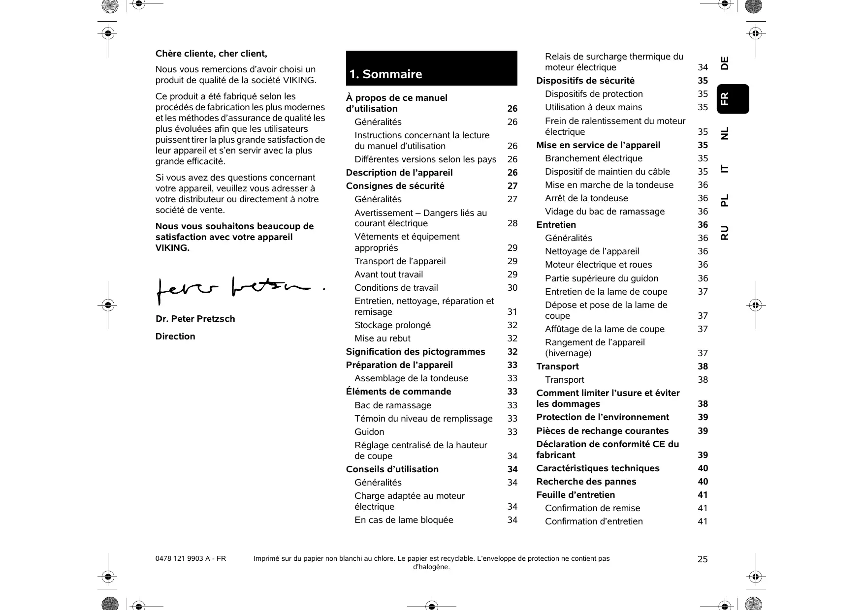 Si, au cours de l’utilisation de l’appareil, une surcharge du moteur électrique se produit, le relais de surcharge thermique intégré déclenche l’arrêt automatique du moteur électrique. Causes d’une surcharge : – l’herbe à tondre est trop haute ou la hauteur de coupe réglée est trop basse, – la vitesse d’avancement est trop élevée, – le nettoyage des fentes d’aération (guidage de l’air de refroidissement) est insuffisant, – la lame est émoussée ou usée, – le câble de raccordement est inapproprié ou trop long – chute de tension (Ö 10.1). Remise en service Après un temps de refroidissement de 20 mn maxi. (en fonction de la température ambiante), remettre l’appareil en service comme d’habitude (Ö 10.). 0478 121 9903 A - FR