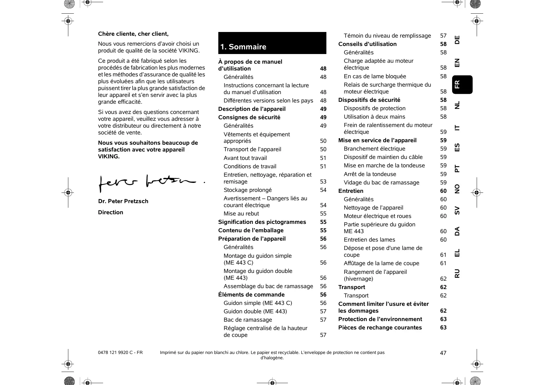 Le présent manuel d’utilisation est une notice originale du fabricant conformément à la directive de l’Union Européenne 2006/42/EC. La philosophie de VIKING consiste à poursuivre le développement de tous ses produits. Ceux-ci sont donc susceptibles de faire l’objet de modifications et de perfectionnements techniques. Les représentations graphiques, les photos ou les données techniques peuvent être modifiées. C’est pourquoi elles n’ont aucun caractère contractuel.