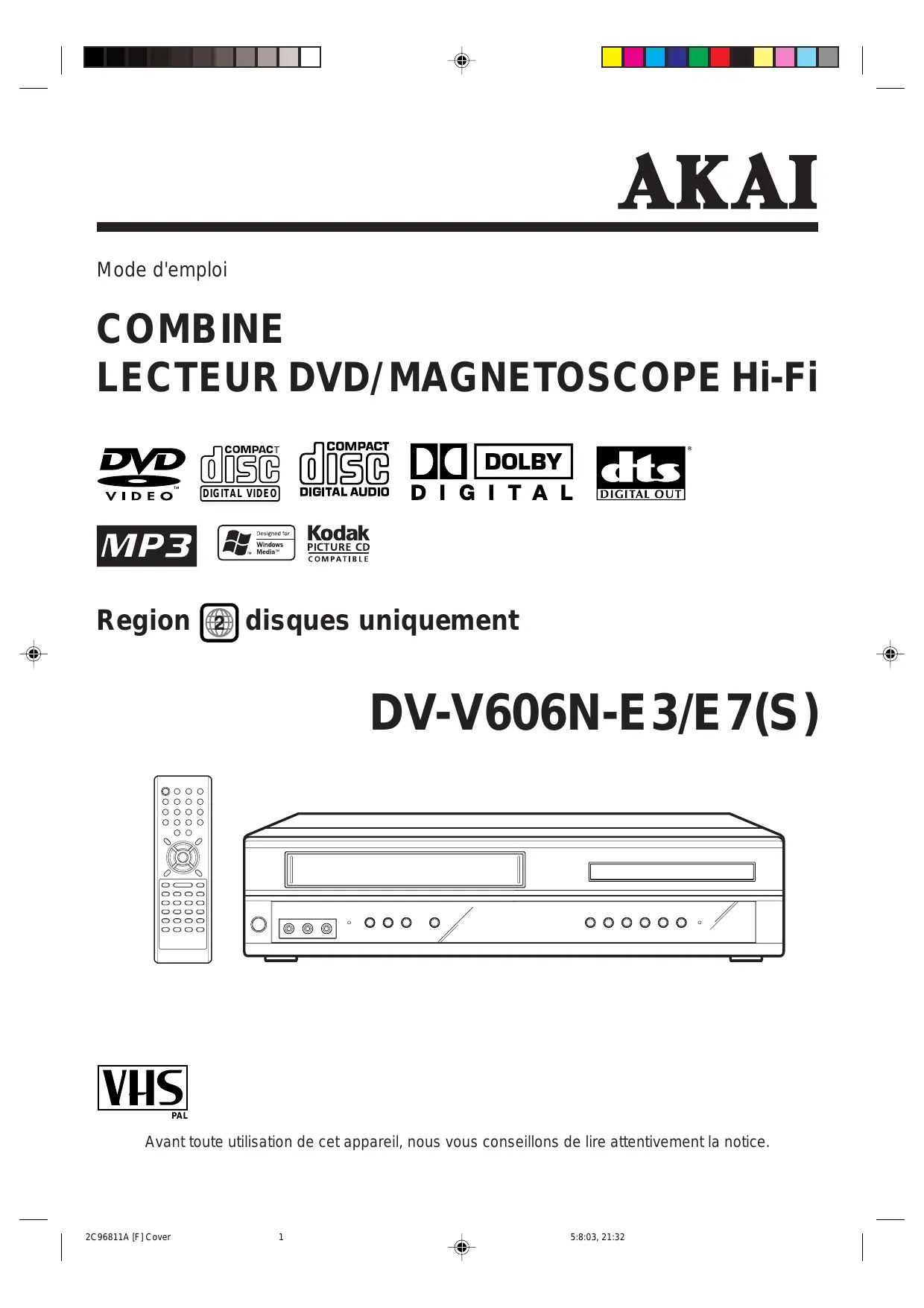 =) Kodak MP38EÉEte COMPATIBLE Region [&)] disques uniquement DV-V6O6N-E 3/E7(S) l | oo 0666 000 0 000000: Avant toute utilisation de cet appareil, nous vous conseillons de lire attentivement la notice. 2C96811A [F] Cover 1 5:8:03, 21:32
