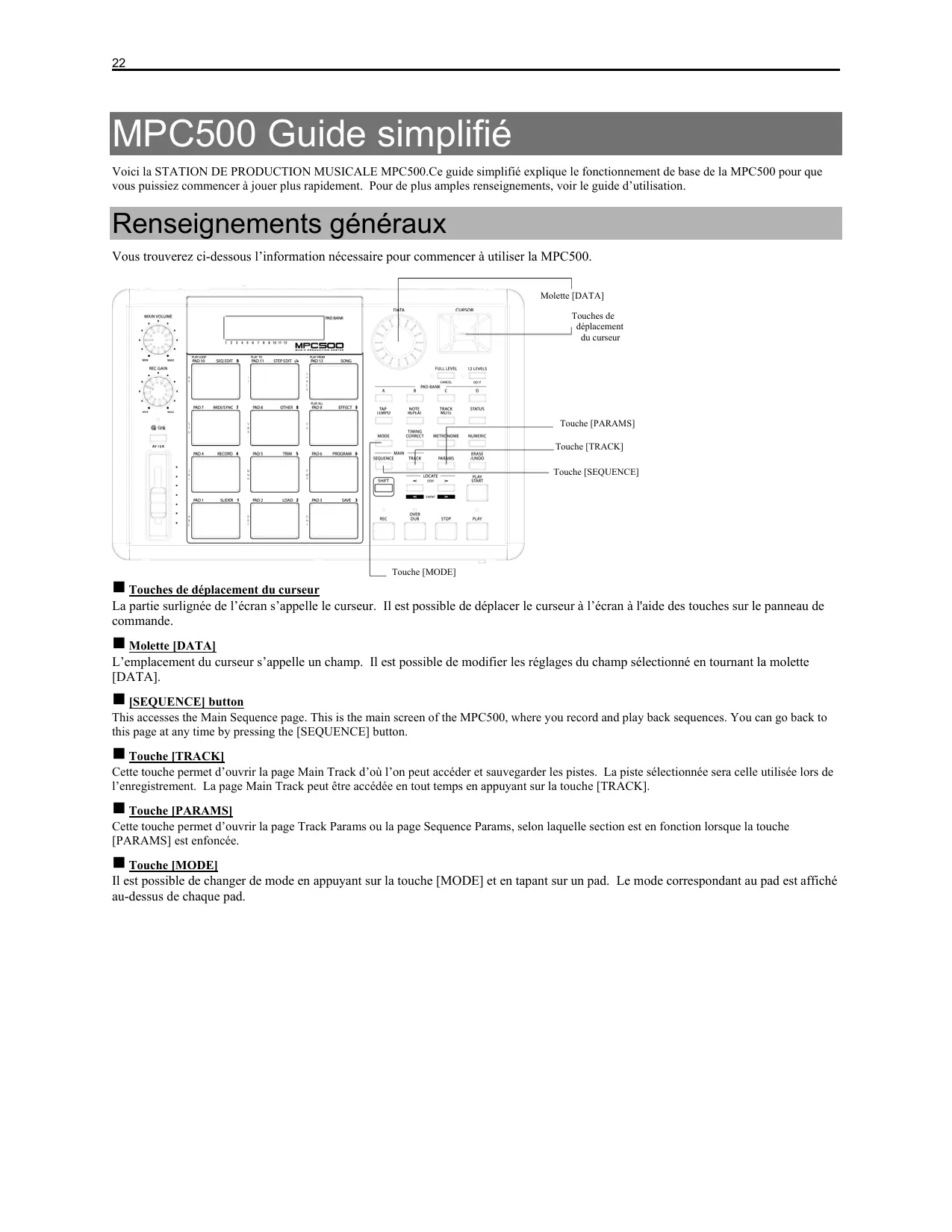 Voici la STATION DE PRODUCTION MUSICALE MPC500.Ce guide simplifié explique le fonctionnement de base de la MPC500 pour que vous puissiez commencer à jouer plus rapidement. Pour de plus amples renseignements, voir le guide d’utilisation.