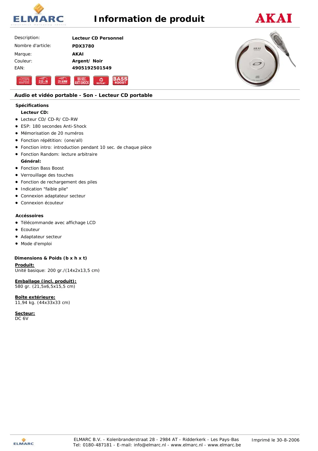Audio et vidéo portable - Son - Lecteur CD portable Spécifications Lecteur CD: Lecteur CD/ CD-R/ CD-RW ESP: 180 secondes Anti-Shock Mémorisation de 20 numéros Fonction répétition: (one/all) Fonction intro: introduction pendant 10 sec. de chaque pièce Fonction Random: lecture arbitraire Général: Fonction Bass Boost Verrouillage des touches Fonction de rechargement des piles Indication "faible pile" Connexion adaptateur secteur Connexion écouteur Accéssoires Télécommande avec affichage LCD Ecouteur Adaptateur secteur Mode d'emploi Dimensions & Poids (b x h x t) Produit: Unité basique: 200 gr./(14x2x13,5 cm) Emballage (incl. produit): 580 gr. (21,5x6,5x15,5 cm) Boîte extérieure: 11,94 kg. (44x33x33 cm) Secteur: