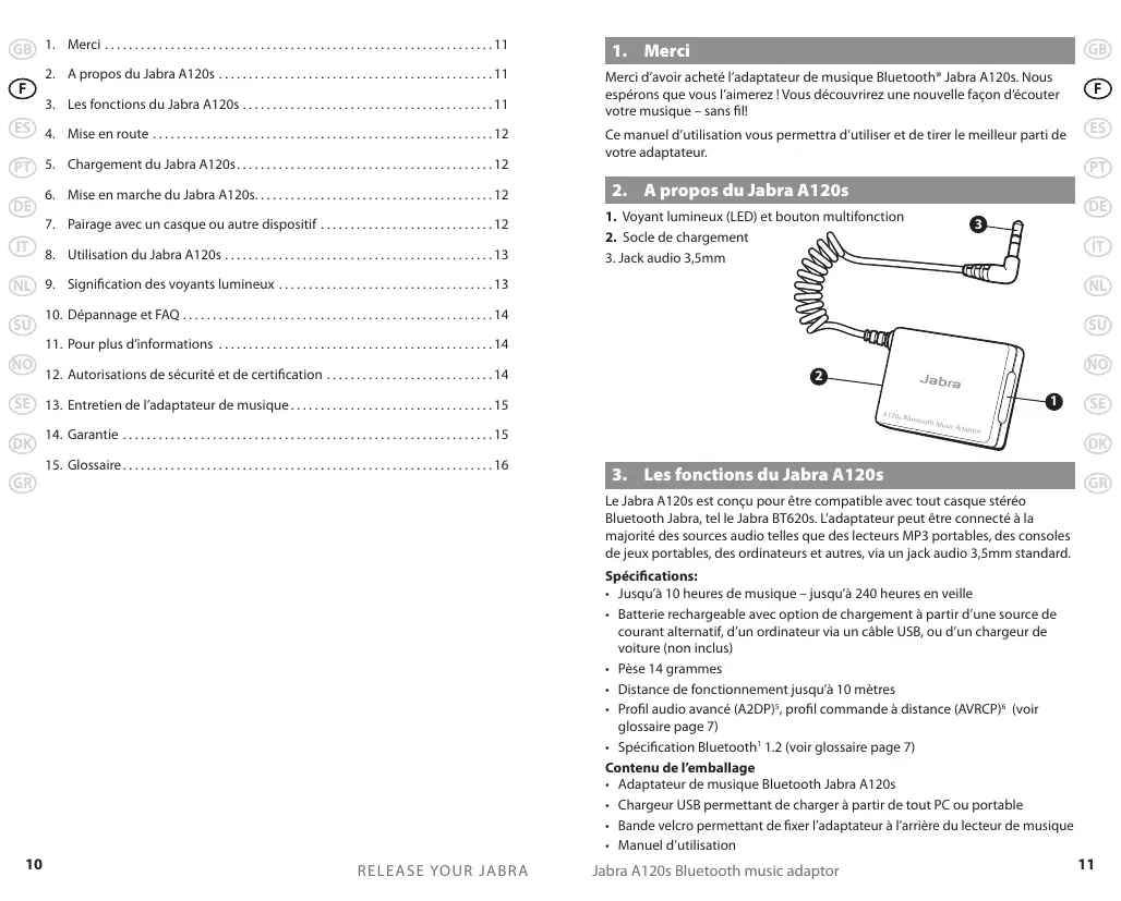 GB Merci d’avoir acheté l’adaptateur de musique Bluetooth® Jabra A120s. Nous espérons que vous l’aimerez ! Vous découvrirez une nouvelle façon d’écouter votre musique – sans fil!