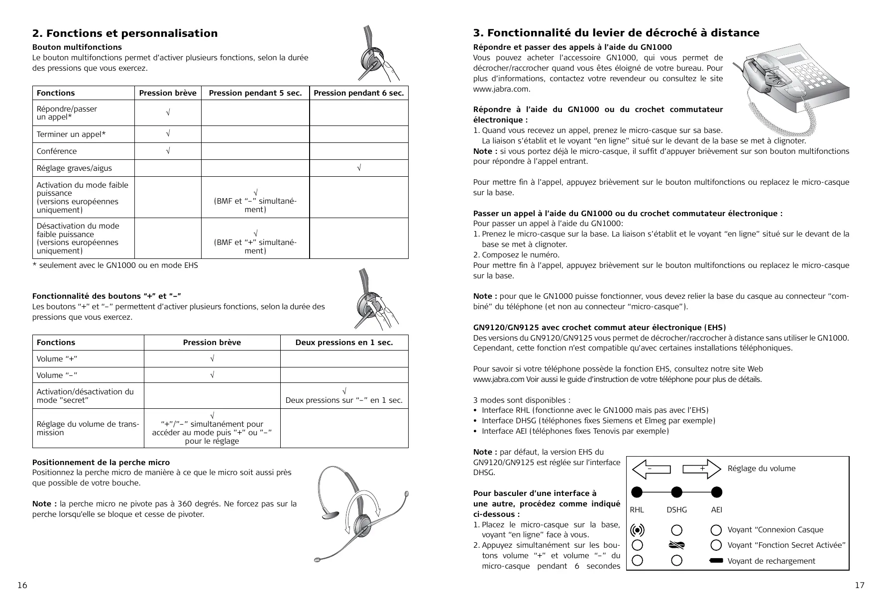 Passer un appel à l’aide du GN1000 ou du crochet commutateur électronique : Pour passer un appel à l’aide du GN1000: 1. Prenez le micro-casque sur la base. La liaison s’établit et le voyant “en ligne” situé sur le devant de la base se met à clignoter. 2. Composez le numéro. Pour mettre fin à l’appel, appuyez brièvement sur le bouton multifonctions ou replacez le micro-casque sur la base. Note : pour que le GN1000 puisse fonctionner, vous devez relier la base du casque au connecteur “combiné” du téléphone (et non au connecteur “micro-casque”). GN9120/GN9125 avec crochet commut ateur électronique (EHS) Des versions du GN9120/GN9125 vous permet de décrocher/raccrocher à distance sans utiliser le GN1000. Cependant, cette fonction n’est compatible qu’avec certaines installations téléphoniques. Pour savoir si votre téléphone possède la fonction EHS, consultez notre site Web www.jabra.com Voir aussi le guide d’instruction de votre téléphone pour plus de détails.