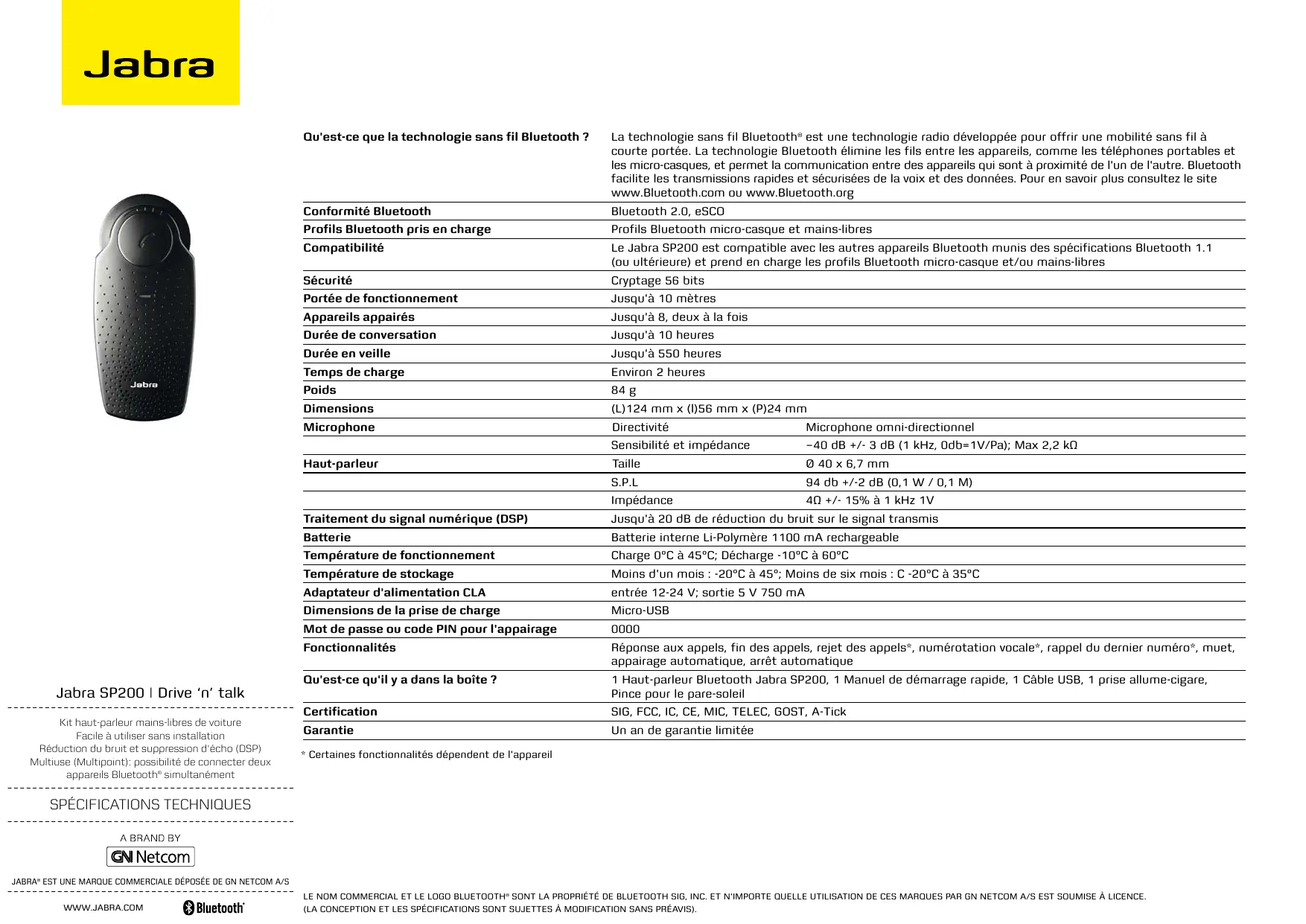 Compatibilité Le Jabra SP200 est compatible avec les autres appareils Bluetooth munis des spécifications Bluetooth 1.1 {ou ultérieure) et prend en charge les profils Bluetooth micro-casque et/ou mains-libres Sécurité Cryptage 56 bits