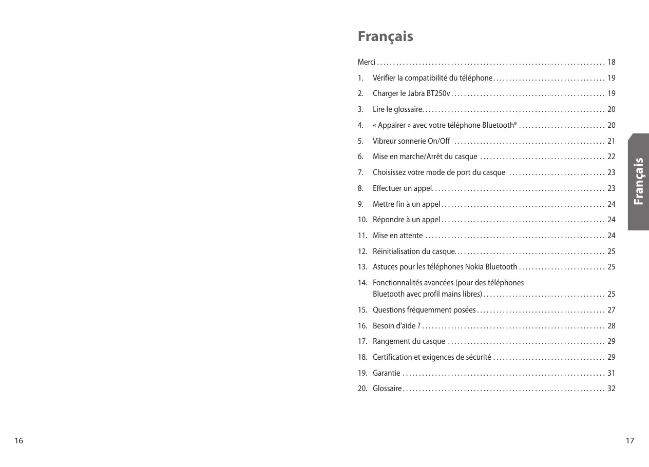 11. Mise en attente . . . . . . . . . . . . . . . . . . . . . . . . . . . . . . . . . . . . . . . . . . . . . . . . . . . . . . . . 24 12. Réinitialisation du casque. . . . . . . . . . . . . . . . . . . . . . . . . . . . . . . . . . . . . . . . . . . . . . . 25 13. Astuces pour les téléphones Nokia Bluetooth . . . . . . . . . . . . . . . . . . . . . . . . . . . 25 14. Fonctionnalités avancées (pour des téléphones Bluetooth avec profil mains libres) . . . . . . . . . . . . . . . . . . . . . . . . . . . . . . . . . . . . . . 25 15. Questions fréquemment posées . . . . . . . . . . . . . . . . . . . . . . . . . . . . . . . . . . . . . . . . 27 16. Besoin d’aide ? . . . . . . . . . . . . . . . . . . . . . . . . . . . . . . . . . . . . . . . . . . . . . . . . . . . . . . . . . 28 17. Rangement du casque . . . . . . . . . . . . . . . . . . . . . . . . . . . . . . . . . . . . . . . . . . . . . . . . . 29 18. Certification et exigences de sécurité . . . . . . . . . . . . . . . . . . . . . . . . . . . . . . . . . . . 29 19. Garantie . . . . . . . . . . . . . . . . . . . . . . . . . . . . . . . . . . . . . . . . . . . . . . . . . . . . . . . . . . . . . . . 31 20. Glossaire . . . . . . . . . . . . . . . . . . . . . . . . . . . . . . . . . . . . . . . . . . . . . . . . . . . . . . . . . . . . . . . 32