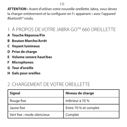 FR ATTENTION : Avant d'utiliser votre nouvelle oreillette Jabra, vous devez la charger entièrement et la configurer en l'« appairant » avec l'appareil Bluetooth® voulu.