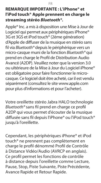 REMARQUE IMPORTANTE : L'iPhone® et l'iPod touch® Apple prennent en charge le streaming stéréo Bluetooth®. Apple® Inc. a mis à disposition une Mise à Jour de Logiciel qui permet aux périphériques iPhone® 3G et 3GS et iPod touch® (2ème génération) d’Apple de diffuser de la musique en stéréo sans fil via Bluetooth® depuis le périphérique vers un micro-casque muni de la fonction Bluetooth® qui prend en charge le Profil de Distribution Audio Avancé (A2DP). Veuillez noter que la version 3.0 ou ultérieure de la Mise à Jour du Logiciel iPhone® est obligatoire pour faire fonctionner le microcasque. Ce logiciel doit être acheté, car il est vendu séparément (consultez le site www.apple.com pour plus d’informations et pour l’acheter). Votre oreillette stéréo Jabra HALO technologie Bluetooth® sans fil prend en charge ce profil A2DP qui vous permet d'écouter de la musique diffusée sans fil depuis l'iPhone® ou l'iPod touch® jusqu'à l'oreillette. Cependant, les périphériques iPhone® et iPod touch® ne prennent pas complètement en charge le profil dénommé Profil de Contrôle à Distance Vidéo/Audio (AVRCP en anglais). Ce profil permet les fonctions de contrôle à distance depuis l'oreillette comme Lecture, Pause, Stop, Piste Suivante, Piste Précédente, Avance Rapide et Retour Rapide.