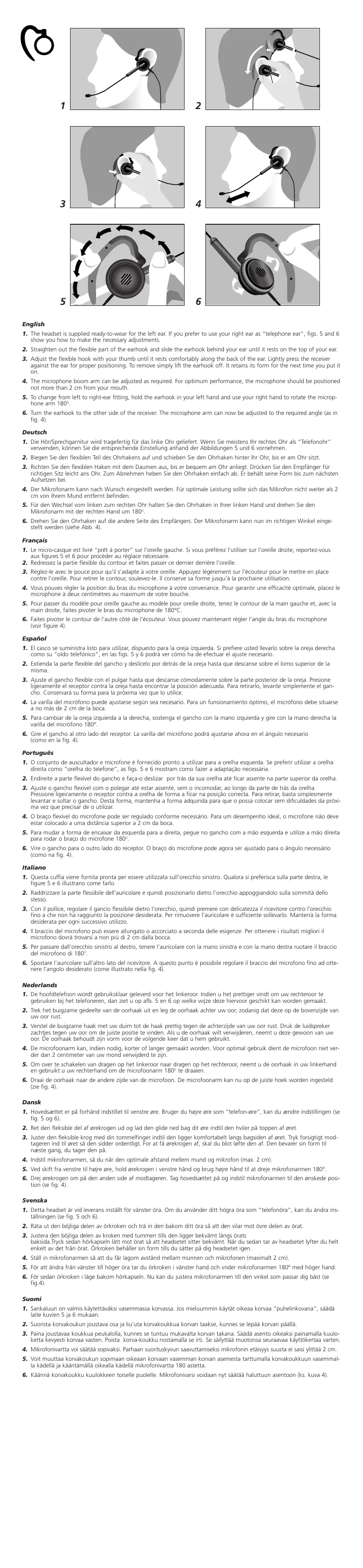 5.-6. Pour passer du modèle pour oreille gauche au modèle pour oreille droite, tenez l’écouteur dans la main gauche et, avec la main droite, tournez le bras du microphone vers le haut pour l’amener au delà de l’arceau serre-tête. Une butée à droite et à gauche interdisant une rotation complète, ne tentez pas d’aller au delà de ces butées. Español 1.