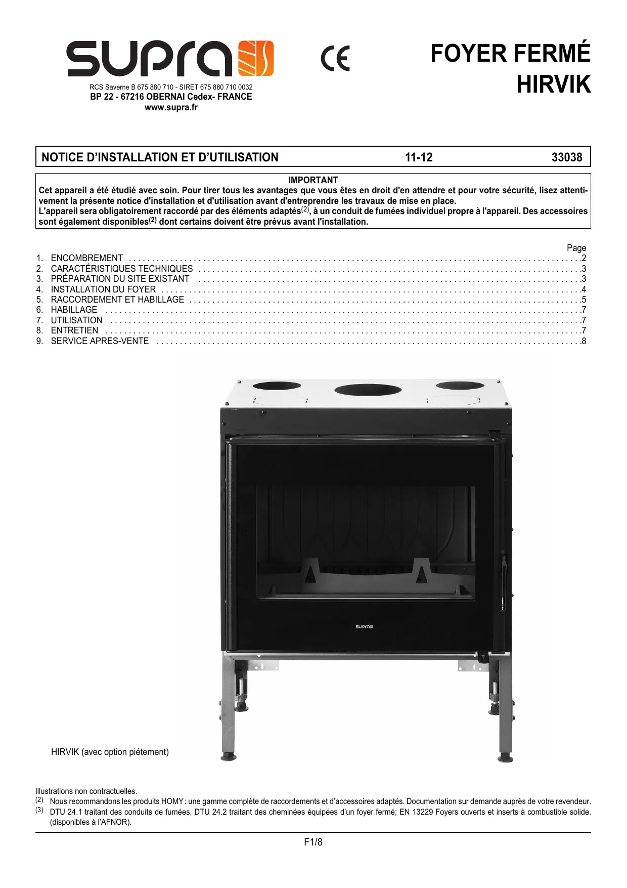 En cas d’incident dans l’habitation (feu de cheminée, départ de feu dans le foyer, vents très violents,..), fermer rapidement la porte de chargement et fermer les commandes du foyer. F8/8 RCS Saverne B 675 880 710 - SIRET 675 880 710 0032 BP 22 - 67216 OBERNAI Cedex- FRANCE www.supra.fr 33038-11-12