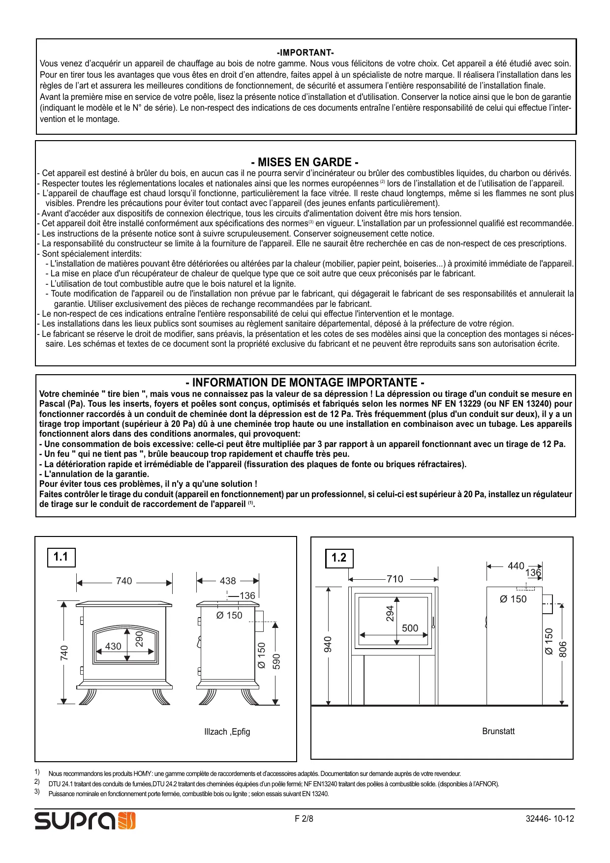 -IMPORTANT -IMPORTANT-Vous venez d’acquérir un appareil de chauffage au bois de notre gamme. Nous vous félicitons de votre choix. Cet appareil a été étudié avec soin. Pour en tirer tous les avantages que vous êtes en droit d’en attendre, faites appel à un spécialiste de notre marque. Il réalisera l’installation dans les règles de l’art et assurera les meilleures conditions de fonctionnement, de sécurité et assumera l’entière responsabilité de l’installation finale. Avant la première mise en service de votre poêle, lisez la présente notice d’installation et d'utilisation. Conserver la notice ainsi que le bon de garantie (indiquant le modèle et le N° de série). Le non-respect des indications de ces documents entraîne l’entière responsabilité de celui qui effectue l’intervention et le montage.