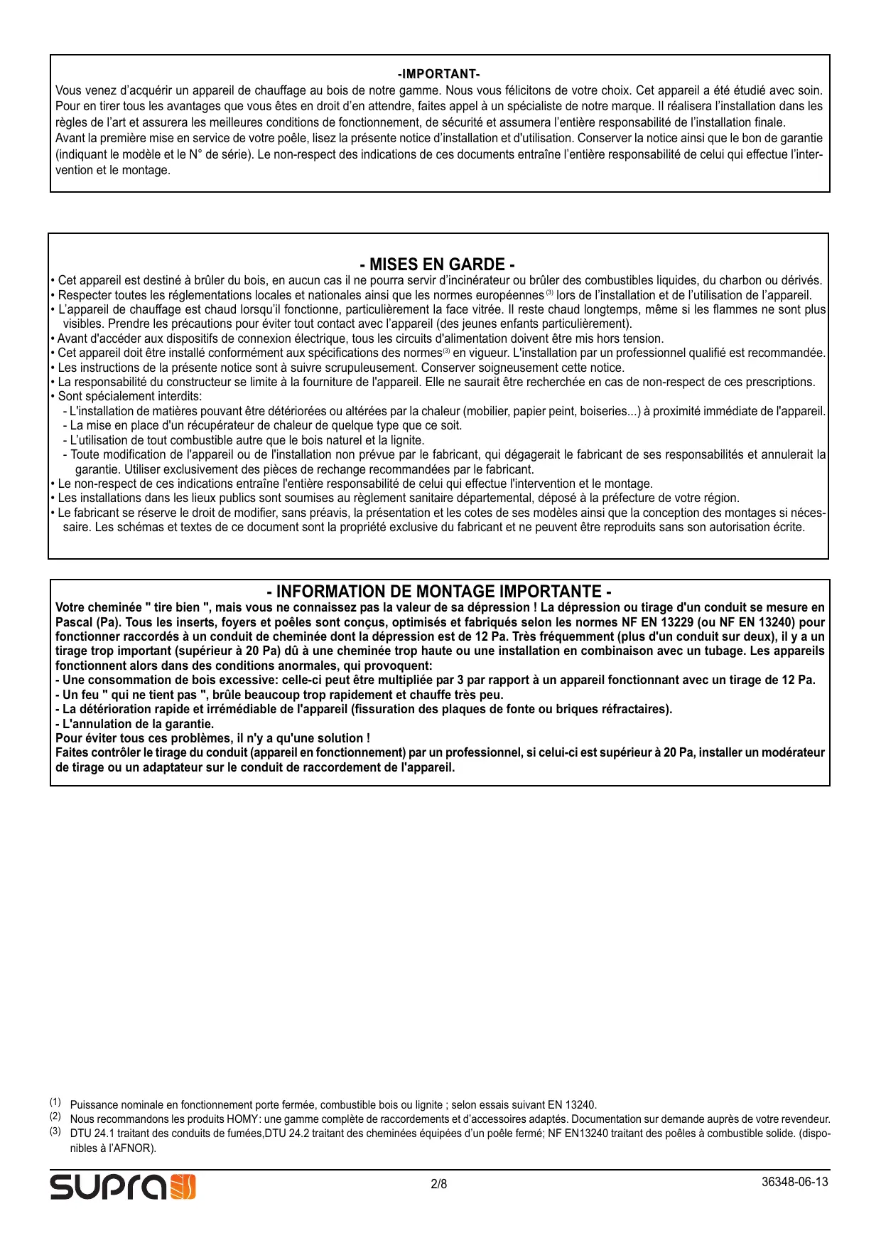 Votre cheminée " tire bien ", mais vous ne connaissez pas la valeur de sa dépression ! La dépression ou tirage d'un conduit se mesure en Pascal (Pa). Tous les inserts, foyers et poêles sont conçus, optimisés et fabriqués selon les normes NF EN 13229 (ou NF EN 13240) pour fonctionner raccordés à un conduit de cheminée dont la dépression est de 12 Pa. Très fréquemment (plus d'un conduit sur deux), il y a un tirage trop important (supérieur à 20 Pa) dû à une cheminée trop haute ou une installation en combinaison avec un tubage. Les appareils fonctionnent alors dans des conditions anormales, qui provoquent: - Une consommation de bois excessive: celle-ci peut être multipliée par 3 par rapport à un appareil fonctionnant avec un tirage de 12 Pa. - Un feu " qui ne tient pas ", brûle beaucoup trop rapidement et chauffe très peu. - La détérioration rapide et irrémédiable de l'appareil (fissuration des plaques de fonte ou briques réfractaires). - L'annulation de la garantie. Pour éviter tous ces problèmes, il n'y a qu'une solution ! Faites contrôler le tirage du conduit (appareil en fonctionnement) par un professionnel, si celui-ci est supérieur à 20 Pa, installer un modérateur de tirage ou un adaptateur sur le conduit de raccordement de l'appareil. (1) Puissance nominale en fonctionnement porte fermée, combustible bois ou lignite ; selon essais suivant EN 13240. (2) Nous recommandons les produits HOMY: une gamme complète de raccordements et d’accessoires adaptés. Documentation sur demande auprès de votre revendeur. (3) DTU 24.1 traitant des conduits de fumées,DTU 24.2 traitant des cheminées équipées d’un poêle fermé; NF EN13240 traitant des poêles à combustible solide. (dispo- nibles à l’AFNOR). 2/8 36348-06-13