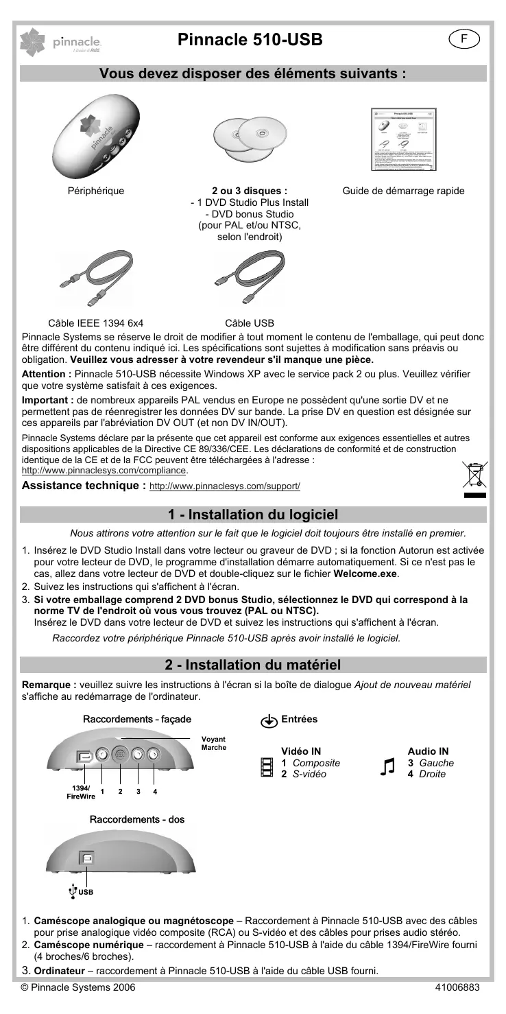 Vous devez disposer des éléments suivants : Périphérique 2 ou 3 disques : - 1 DVD Studio Plus Install - DVD bonus Studio (pour PAL et/ou NTSC, selon l'endroit) Guide de démarrage rapide Câble IEEE 1394 6x4 Câble USB Pinnacle Systems se réserve le droit de modifier à tout moment le contenu de l'emballage, qui peut donc être différent du contenu indiqué ici. Les spécifications sont sujettes à modification sans préavis ou obligation. Veuillez vous adresser à votre revendeur s'il manque une pièce. Attention : Pinnacle 510-USB nécessite Windows XP avec le service pack 2 ou plus. Veuillez vérifier que votre système satisfait à ces exigences. Important : de nombreux appareils PAL vendus en Europe ne possèdent qu'une sortie DV et ne permettent pas de réenregistrer les données DV sur bande. La prise DV en question est désignée sur ces appareils par l'abréviation DV OUT (et non DV IN/OUT). Pinnacle Systems déclare par la présente que cet appareil est conforme aux exigences essentielles et autres dispositions applicables de la Directive CE 89/336/CEE. Les déclarations de conformité et de construction identique de la CE et de la FCC peuvent être téléchargées à l'adresse : http://www.pinnaclesys.com/compliance. Assistance technique : http://www.pinnaclesys.com/support/