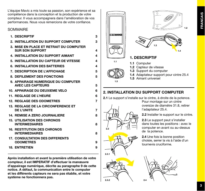 L’équipe Mavic a mis toute sa passion, son expérience et sa compétence dans la conception et la production de votre compteur. Il vous accompagnera dans l’amélioration de vos performances. Nous vous remercions de votre confiance.