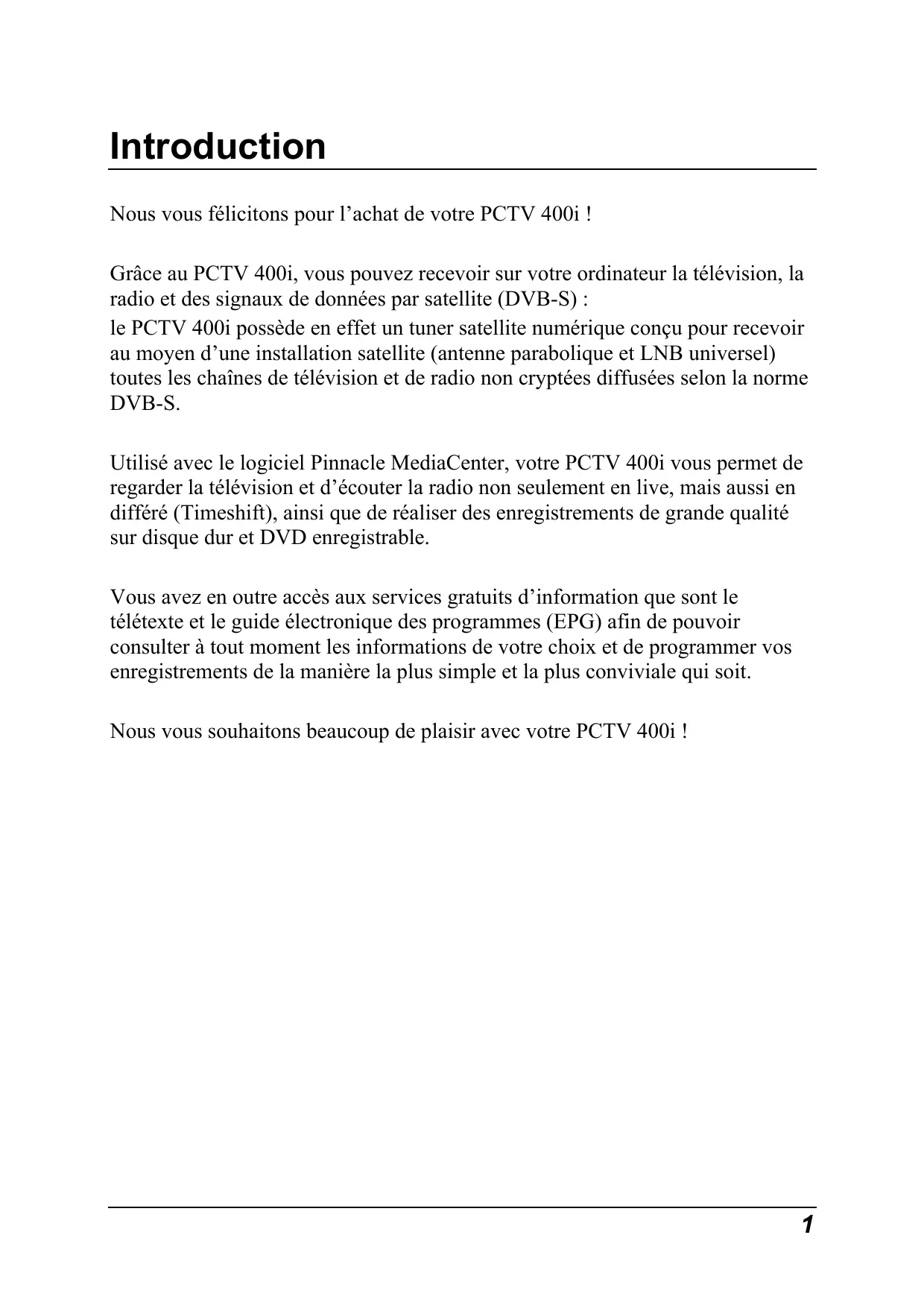 Introduction Nous vous félicitons pour l’achat de votre PCTV 400i ! Grâce au PCTV 400i, vous pouvez recevoir sur votre ordinateur la télévision, la radio et des signaux de données par satellite (DVB-S) : le PCTV 400i possède en effet un tuner satellite numérique conçu pour recevoir au moyen d’une installation satellite (antenne parabolique et LNB universel) toutes les chaînes de télévision et de radio non cryptées diffusées selon la norme DVB-S. Utilisé avec le logiciel Pinnacle MediaCenter, votre PCTV 400i vous permet de regarder la télévision et d’écouter la radio non seulement en live, mais aussi en différé (Timeshift), ainsi que de réaliser des enregistrements de grande qualité sur disque dur et DVD enregistrable. Vous avez en outre accès aux services gratuits d’information que sont le télétexte et le guide électronique des programmes (EPG) afin de pouvoir consulter à tout moment les informations de votre choix et de programmer vos enregistrements de la manière la plus simple et la plus conviviale qui soit. Nous vous souhaitons beaucoup de plaisir avec votre PCTV 400i !