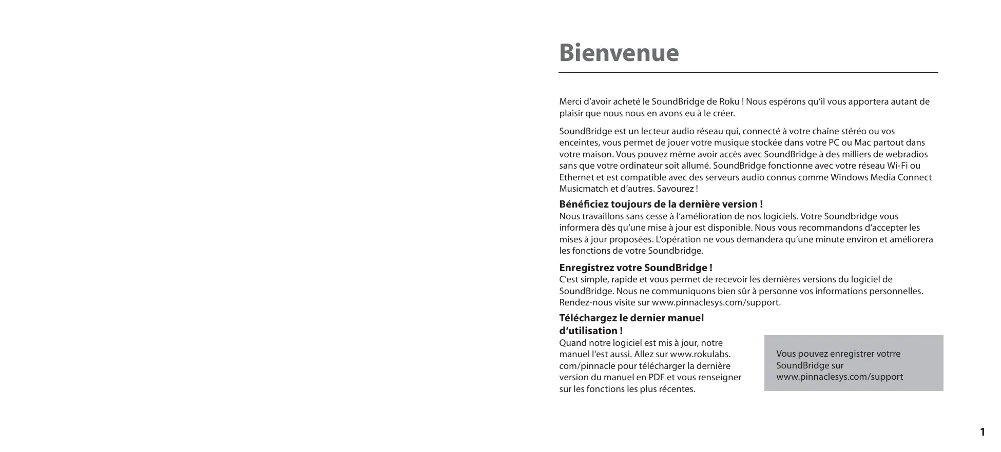ABSCHNITT 7: Parachutes Paul’s Boutique Don’t Panic 0:10/2:17 Coldplay - Parachutes (2000) (|||------) Parachutes Paul’s Boutique Bienvenue Merci d‘avoir acheté le SoundBridge de Roku ! Nous espérons qu‘il vous apportera autant de plaisir que nous nous en avons eu à le créer. SoundBridge est un lecteur audio réseau qui, connecté à votre chaîne stéréo ou vos enceintes, vous permet de jouer votre musique stockée dans votre PC ou Mac partout dans votre maison. Vous pouvez même avoir accès avec SoundBridge à des milliers de webradios sans que votre ordinateur soit allumé. SoundBridge fonctionne avec votre réseau Wi-Fi ou Ethernet et est compatible avec des serveurs audio connus comme Windows Media Connect Musicmatch et d‘autres. Savourez ! Bénéficiez toujours de la dernière version ! Nous travaillons sans cesse à l‘amélioration de nos logiciels. Votre Soundbridge vous informera dès qu‘une mise à jour est disponible. Nous vous recommandons d‘accepter les mises à jour proposées. L’opération ne vous demandera qu’une minute environ et améliorera les fonctions de votre Soundbridge. Enregistrez votre SoundBridge ! C‘est simple, rapide et vous permet de recevoir les dernières versions du logiciel de SoundBridge. Nous ne communiquons bien sûr à personne vos informations personnelles. Rendez-nous visite sur www.pinnaclesys.com/support. Téléchargez le dernier manuel d‘utilisation ! Quand notre logiciel est mis à jour, notre manuel l‘est aussi. Allez sur www.rokulabs. com/pinnacle pour télécharger la dernière version du manuel en PDF et vous renseigner sur les fonctions les plus récentes. Vous pouvez enregistrer votrre SoundBridge sur www.pinnaclesys.com/support