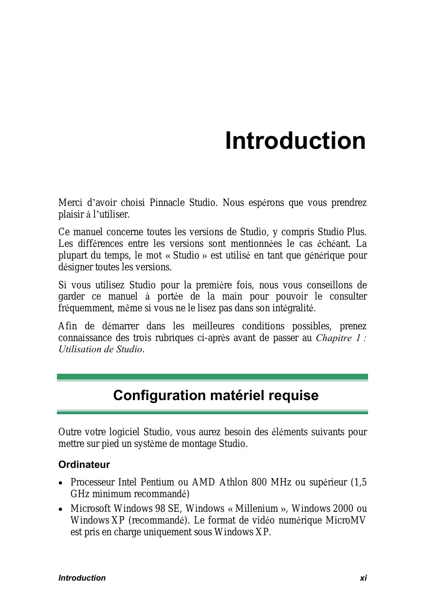 Introduction Merci d’avoir choisi Pinnacle Studio. Nous espérons que vous prendrez plaisir à l’utiliser. Ce manuel concerne toutes les versions de Studio, y compris Studio Plus. Les différences entre les versions sont mentionnées le cas échéant. La plupart du temps, le mot « Studio » est utilisé en tant que générique pour désigner toutes les versions. Si vous utilisez Studio pour la première fois, nous vous conseillons de garder ce manuel à portée de la main pour pouvoir le consulter fréquemment, même si vous ne le lisez pas dans son intégralité. Afin de démarrer dans les meilleures conditions possibles, prenez connaissance des trois rubriques ci-après avant de passer au Chapitre 1 : Utilisation de Studio.