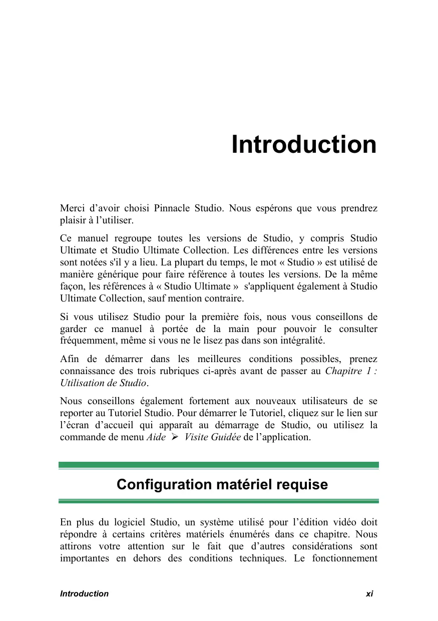 Introduction Merci d’avoir choisi Pinnacle Studio. Nous espérons que vous prendrez plaisir à l’utiliser. Ce manuel regroupe toutes les versions de Studio, y compris Studio Ultimate et Studio Ultimate Collection. Les différences entre les versions sont notées s'il y a lieu. La plupart du temps, le mot « Studio » est utilisé de manière générique pour faire référence à toutes les versions. De la même façon, les références à « Studio Ultimate » s'appliquent également à Studio Ultimate Collection, sauf mention contraire. Si vous utilisez Studio pour la première fois, nous vous conseillons de garder ce manuel à portée de la main pour pouvoir le consulter fréquemment, même si vous ne le lisez pas dans son intégralité. Afin de démarrer dans les meilleures conditions possibles, prenez connaissance des trois rubriques ci-après avant de passer au Chapitre 1 : Utilisation de Studio. Nous conseillons également fortement aux nouveaux utilisateurs de se reporter au Tutoriel Studio. Pour démarrer le Tutoriel, cliquez sur le lien sur l’écran d’accueil qui apparaît au démarrage de Studio, ou utilisez la commande de menu Aide Visite Guidée de l’application.