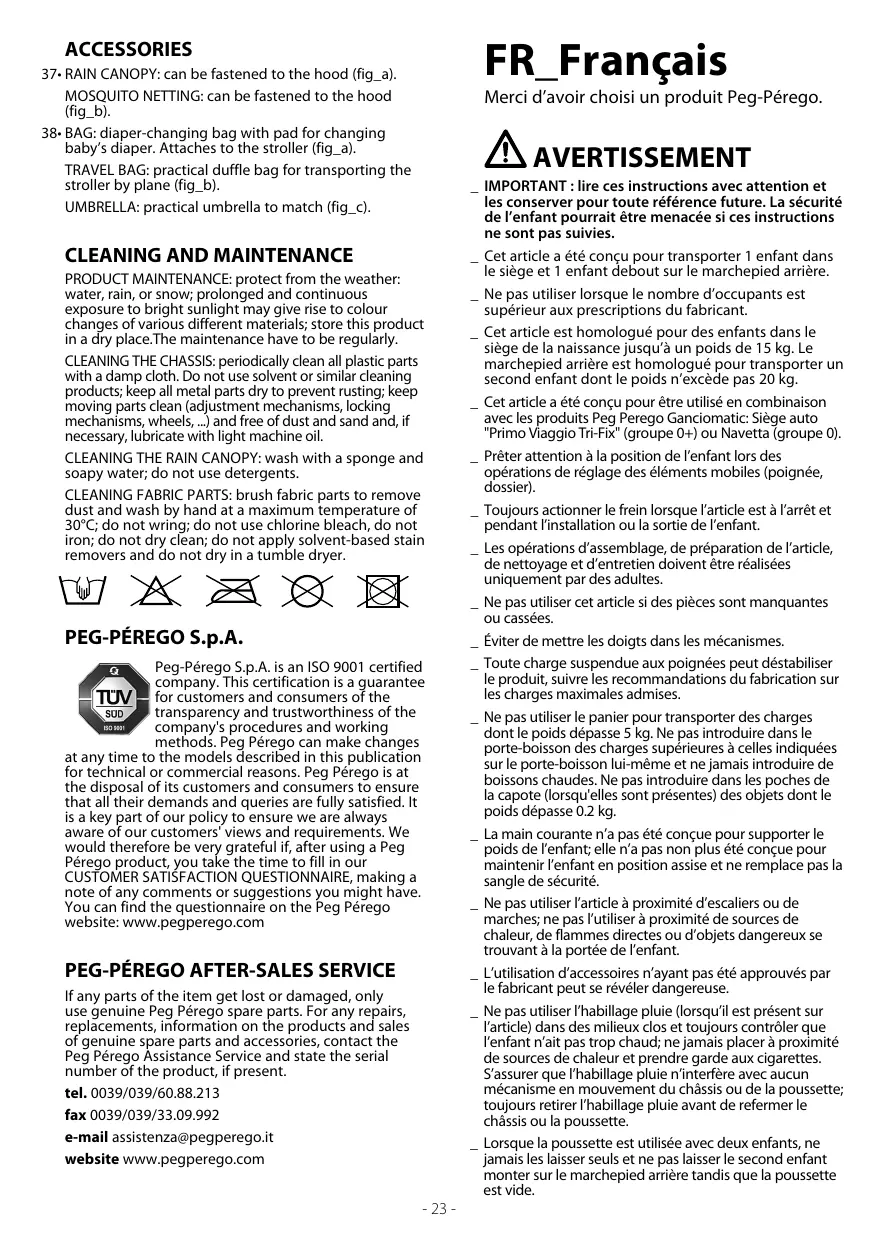 _ Ne pas utiliser lorsque le nombre d’occupants est supérieur aux prescriptions du fabricant. _ Cet article est homologué pour des enfants dans le siège de la naissance jusqu’à un poids de 15 kg. Le marchepied arrière est homologué pour transporter un second enfant dont le poids n’excède pas 20 kg. _ Cet article a été conçu pour être utilisé en combinaison avec les produits Peg Perego Ganciomatic: Siège auto "Primo Viaggio Tri-Fix" (groupe 0+) ou Navetta (groupe 0). _ Prêter attention à la position de l’enfant lors des opérations de réglage des éléments mobiles (poignée, dossier). _ Toujours actionner le frein lorsque l’article est à l’arrêt et pendant l’installation ou la sortie de l’enfant. _ Les opérations d’assemblage, de préparation de l’article, de nettoyage et d’entretien doivent être réalisées uniquement par des adultes. _ Ne pas utiliser cet article si des pièces sont manquantes ou cassées. _ Éviter de mettre les doigts dans les mécanismes. _ Toute charge suspendue aux poignées peut déstabiliser le produit, suivre les recommandations du fabrication sur les charges maximales admises. _ Ne pas utiliser le panier pour transporter des charges dont le poids dépasse 5 kg. Ne pas introduire dans le porte-boisson des charges supérieures à celles indiquées sur le porte-boisson lui-même et ne jamais introduire de boissons chaudes. Ne pas introduire dans les poches de la capote (lorsqu'elles sont présentes) des objets dont le poids dépasse 0.2 kg. _ La main courante n’a pas été conçue pour supporter le poids de l’enfant; elle n’a pas non plus été conçue pour maintenir l’enfant en position assise et ne remplace pas la sangle de sécurité. _ Ne pas utiliser l’article à proximité d’escaliers ou de marches; ne pas l’utiliser à proximité de sources de chaleur, de flammes directes ou d’objets dangereux se trouvant à la portée de l’enfant. _ L’utilisation d’accessoires n’ayant pas été approuvés par le fabricant peut se révéler dangereuse. _ Ne pas utiliser l’habillage pluie (lorsqu’il est présent sur l’article) dans des milieux clos et toujours contrôler que l’enfant n’ait pas trop chaud; ne jamais placer à proximité de sources de chaleur et prendre garde aux cigarettes. S’assurer que l’habillage pluie n’interfère avec aucun mécanisme en mouvement du châssis ou de la poussette; toujours retirer l’habillage pluie avant de refermer le châssis ou la poussette. _ Lorsque la poussette est utilisée avec deux enfants, ne jamais les laisser seuls et ne pas laisser le second enfant monter sur le marchepied arrière tandis que la poussette est vide.