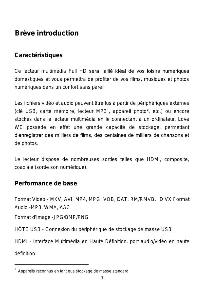 Les fichiers video et audio peuvent être lus à partir de périphériques externes (clé USB, carte mémoire, lecteur MP31, apparéil photo*, etc.) ou encore stockés dans le lecteur multimédia en le connectant à un ordinateur. Love WE possède en effet une grande capacité de stockage, permettant d'enregistrer des milliers de films, des centaines de milliers de chansons et de photos.