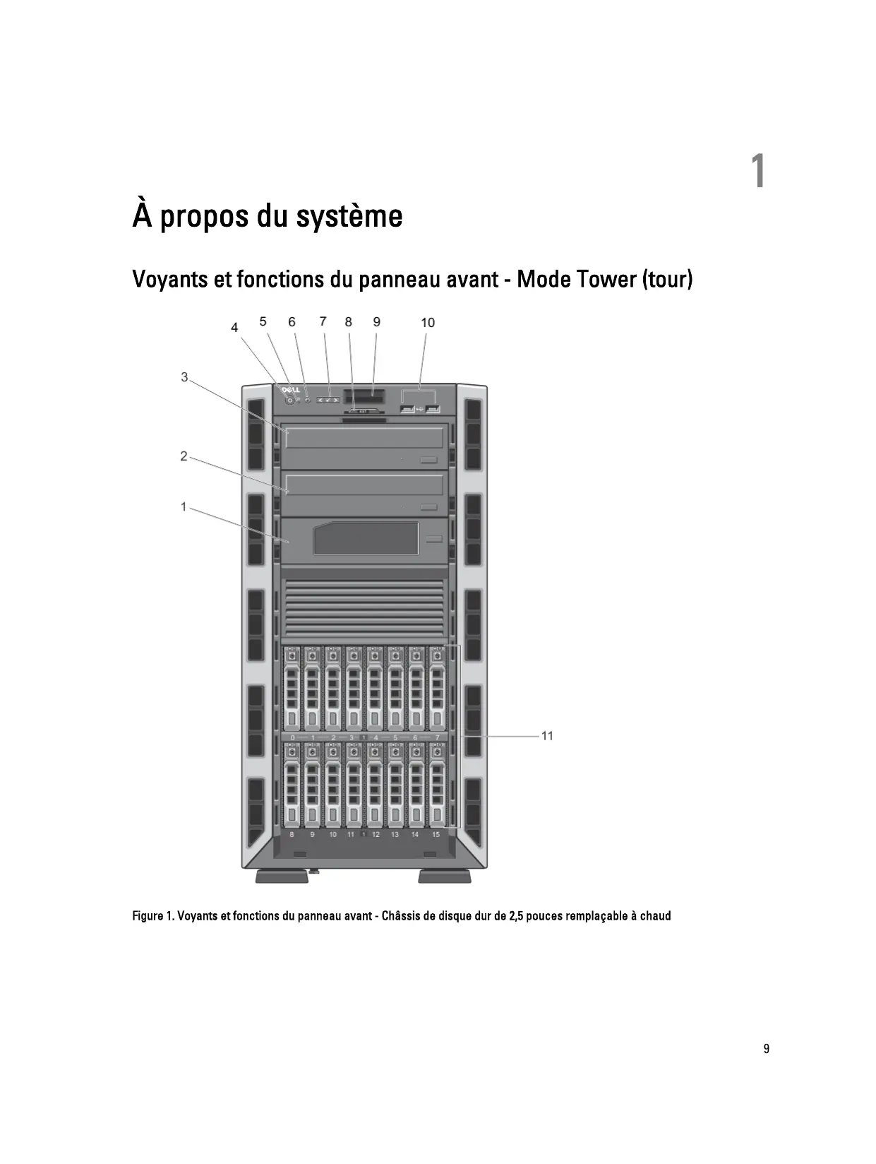 - Voyants et fonctions du panneau avant - Mode Tower (tour) p. 9