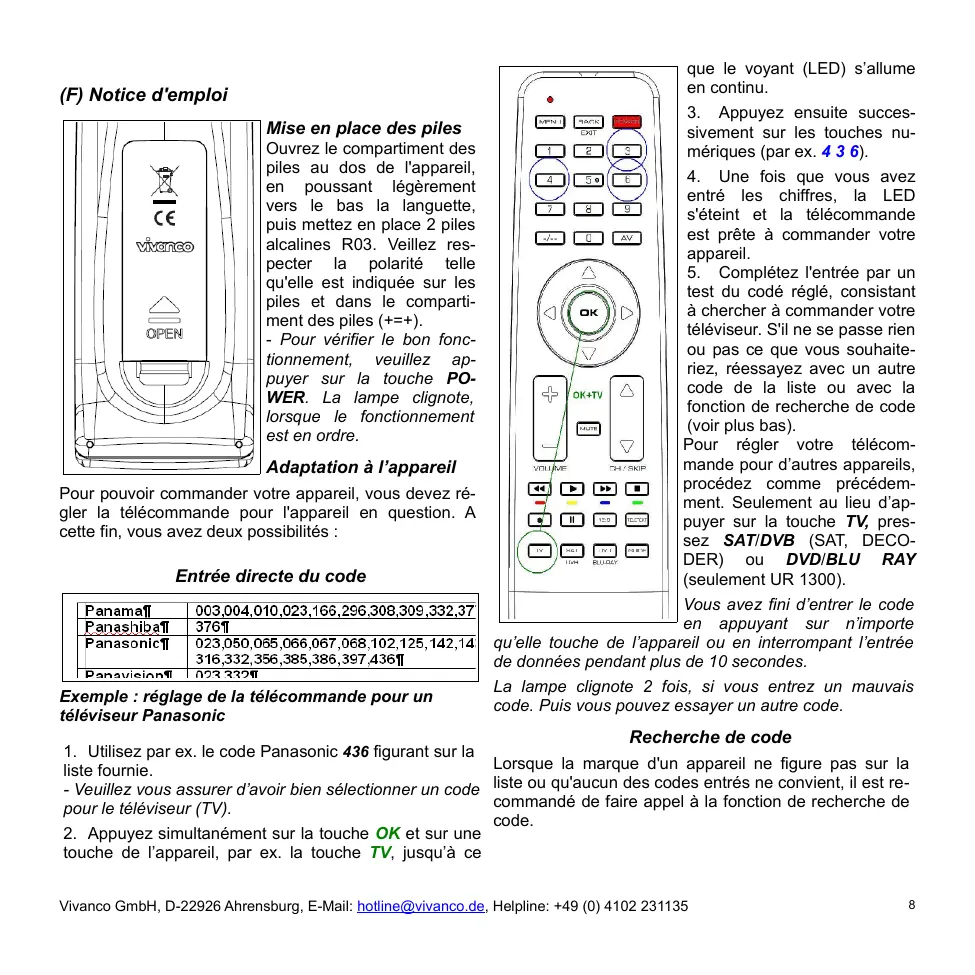 1. Appuyez sur la touche associée à l'appareil dont Comme les symboles sur une télécommande universelle peuvent différer de ceux sur les télécommandes d'orivous souhaitez connaître le code, par ex. TV. gine, il vous faudra peut-être tester toutes les touches 2. Appuyez d'abord sur OK et ensuite sur 1, 2 ou 3, sui- pour découvrir les fonctions de chacune. vant le chiffre du code que vous souhaitez connaître. Spécifications techniques Exemple : Piles: 2 piles rondes, R03, UM4, AAA Si vous avez appuyé sur OK+1 et que le code d’exemple Portée: max. 7 m est réglé sur 4 3 6, le voyant clignote, 4 fois, pour afficher Non pour appareils travaillant sur une fréquence de 400 le chiffre des centaines 4. Vous avez seulement besoin kHz de compter. Avec OK+2 le 10e chiffre est édité, par ex. 3* clignote pour le 3 de 436. Et avec OK+3, le 1er chiffre Garantie d'usine de 2 ans est édité, par ex. 6* clignote pour le 6 de 436. – Pour les En cas de défaut de votre télécommande pendant une période de 2 ans à compter de la date d'achat, Vivanco zéros il n’y pas de clignotement. la remplacera gratuitement. Exceptions : codes manDéfinition d'un appareil pour le volume et le quants, destruction intentionnelle et usure normale du réglage silencieux boîtier et des touches. Appuyez sur la touche associée à l'appareil que vous souhaitez toujours utiliser pour le contrôle audio, par ex. TV. Pour verrouiller, appuyez d'abord sur OK+ 5. Pour déverrouiller, appuyez d'abord sur OK+6.