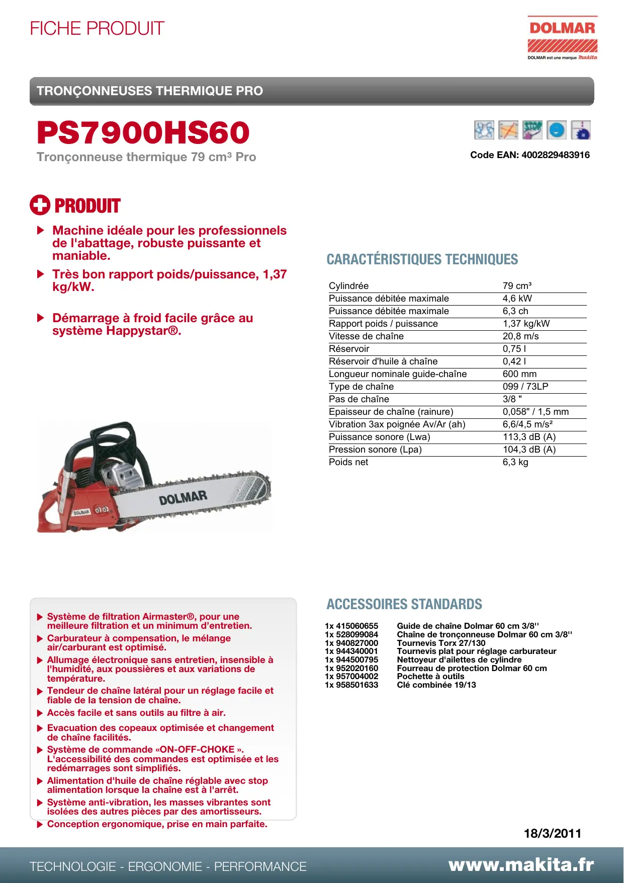 Tronçonneuse thermique 79 cm® Pro Code EAN: 4002829483916 © PRODUIT > Machine idéale pour les professionnels de l'abattage, robuste puissante et maniable. CARACTÉRISTIQUES TECHNIQUES > Très bon rapport poids/puissance, 1,37 kg/kW. Cylindrée 79 cm° Puissance débitée maximale 4,6 KW £ N : : 2 Puissance débitée maximale 6,3 ch > Démarrage à froid facile grâce au Rapport poids / puissance T 37 KR système Happystar®. Vitesse de chaîne 20,8 m/s Réservoir 0,751 Réservoir d'huile à chaîne 0,421 Longueur nominale guide-chaîne 600 mm Type de chaîne 099 / 73LP Pas de chaîne 38" Epaisseur de chaîne (rainure) 0,058" / 1,5 mm Vibration 3ax poignée Av/Ar (ah) 6,6/4,5 m/s? Puissance sonore (Lwa) 113,3 dB (A) Pression sonore (Lpa) 104,3 dB (A) Poids net 6,3 kg ACCESSOIRES STANDARDS » Système de filtration Airmaster®, pour une meilleure filtration et un minimum d’entretien. 1x415060655 Guide de chaîne Dolmar 60 cm 3/8 1x 528099084 Chaîne de tronçonneuse Dolmar 60 cm 3/8" 1x 940827000 Tournevis Torx 27/130 + Carburateur à compensation, le mélange air/carburant est optimisé. 1x944340001 Tournevis plat pour réglage carburateur > Allumage électronique sans entretien, insensible à 1x 944500795 Nettoyeur d'ailettes de cylindre l'humidité, aux poussières et aux variations de 1x952020160 Fourreau de protection Dolmar 60 cm température. 1x 9257004002 Pochette à outils »> Tendeur de chaîne latéral pour un réglage facile et 1x 958501633 Sié combinée 19/18 fiable de la tension de chaîne. » Accès facile et sans outils au filtre à air. » Evacuation des copeaux optimisée et changement de chaîne facilités. » Système de commande «ON-OFF-CHOKE L'accessibilité des commandes est optimi: redémarrages sont simpli » Alimentation d'huile de chaîne réglable avec stop alimentation lorsque la chaîne est à l'arrêt. » Système anti-vibration, les masses vibrantes sont isolées des autres pièces par des amortisseurs. > Conception ergonomique, prise en main parfaite. e et les 18/3/2011 TECH OGIE - ERGONOMIE - PERFORMANCE www.makita.fr
