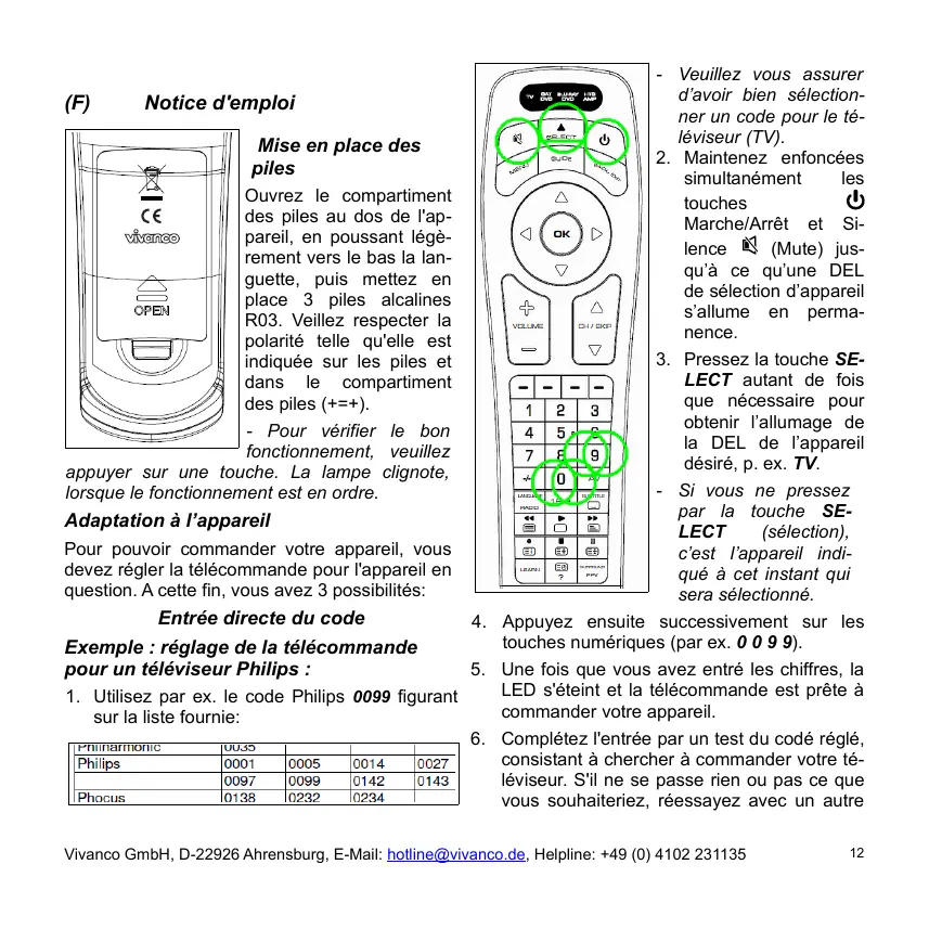 Exemple : réglage de la télécommande pour un téléviseur Philips : 1. Utilisez par ex. le code Philips 0099 figurant sur la liste fournie: