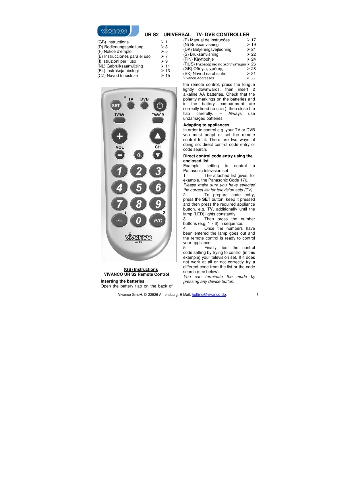 UR S2 - VIVANCO - Notice d'utilisation et mode d'emploi gratuit
