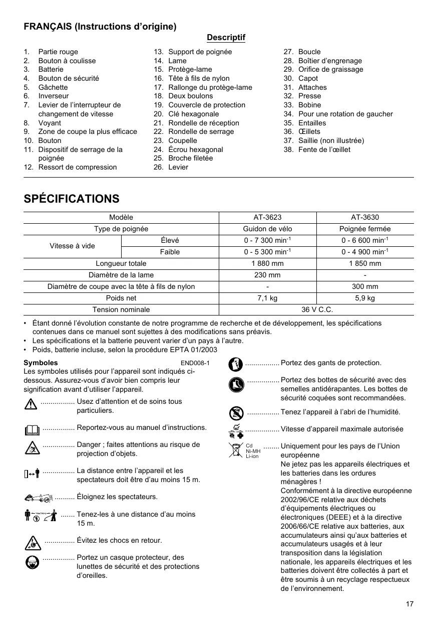 Bruit ENG104-2 Les niveaux de bruit pondéré A typiques ont été mesurés selon la norme ISO22868 : Niveau de pression sonore (LpA) : 79,7 dB (A) Nom de la machine : Débroussailleuse sans-fil N° de modèle/Type : AT-3623 Spécifications : voir le tableau « SPÉCIFICATIONS », sont fabriquées en série et sont conformes aux directives européennes suivantes : 2000/14/CE, 2006/42/CE et sont produites conformément aux normes ou documents de normalisation suivants : EN60745, ISO11806 La documentation technique se trouve dans les locaux de l’entreprise sise : Dolmar GmbH, Jenfelder Straße 38, Abteilung FZ, Nom de la machine : Coupe herbe sans-fil N° de modèle/Type : AT-3630 Spécifications : voir le tableau « SPÉCIFICATIONS », sont fabriquées en série et sont conformes aux directives européennes suivantes : 2000/14/CE, 2006/42/CE 26 De beschermkap monteren (zie afb. 16 en 17) De technische documentatie wordt bewaard door: Dolmar GmbH, Jenfelder Straße 38, Abteilung FZ, D-22045 Hamburg, Duitsland De technische documentatie wordt bewaard door: Dolmar GmbH, Jenfelder Straße 38, Abteilung FZ, D-22045 Hamburg, Duitsland Interruptor de inversión Palanca de cambio de velocidad Luz indicadora Área de corte más eficaz Pomo Abrazadera del asidero Muelle de compresión Soporte del asidero Extensión de la protección Dos pernos Cubierta protectora Llave hexagonal Arandela de apoyo 4. Cuando no se utilice la batería, manténgala alejada de otros objetos metálicos, como clips de papel, monedas, llaves, clavos, tornillos u otros objetos metálicos pequeños que puedan establecer una conexión entre los terminales. El cortocircuito de los terminales de la batería puede provocar quemaduras o un incendio. 5. En condiciones de maltrato, la batería puede expulsar líquido; evite el contacto con él. Si se produce un contacto accidental, lávelo con agua. Si el líquido entra en contacto con los ojos, adicionalmente,