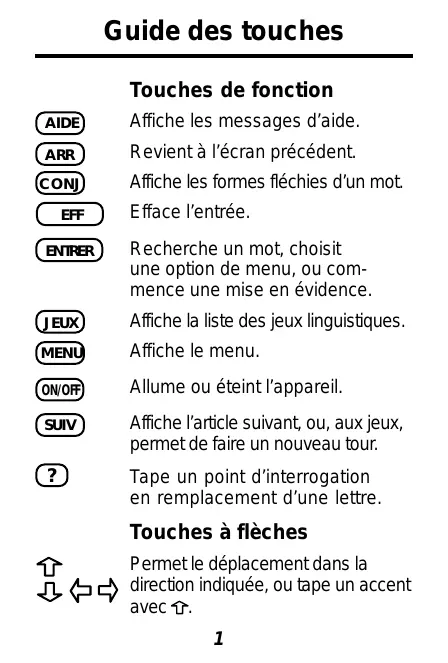 DMF-210 Guide des touches Touches de fonction AIDE Affiche les messages d’aide. ARR Revient à l’écran précédent. CONJ EFF Affiche les formes fléchies d’un mot. Efface l’entrée. ENTRER Recherche un mot, choisit une option de menu, ou commence une mise en évidence. JEUX Affiche la liste des jeux linguistiques. MENU Affiche le menu. ON/OFF Allume ou éteint l’appareil. SUIV Affiche l’article suivant, ou, aux jeux, permet de faire un nouveau tour.