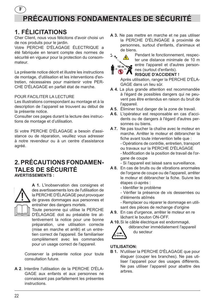 Toute personne qui utilise la PERCHE D'ÉLAGAGE doit au préalable lire attentivement la notice pour une bonne préparation, une utilisation correcte (mise en marche et arrêt) et un entretien correct de l'appareil. Se familiariser complètement avec les commandes pour un usage correct de l'appareil. Conserver la présente notice pour toute consultation future. A 2. Interdire l'utilisation de la PERCHE D'ÉLAGAGE aux enfants et aux personnes ne connaissant pas parfaitement les présentes instructions.