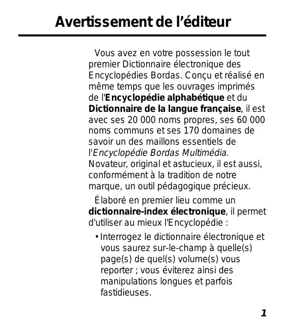 Avertissement de l’éditeur Vous avez en votre possession le tout premier Dictionnaire électronique des Encyclopédies Bordas. Conçu et réalisé en même temps que les ouvrages imprimés de l'Encyclopédie alphabétique et du Dictionnaire de la langue française, il est avec ses 20 000 noms propres, ses 60 000 noms communs et ses 170 domaines de savoir un des maillons essentiels de l'Encyclopédie Bordas Multimédia. Novateur, original et astucieux, il est aussi, conformément à la tradition de notre marque, un outil pédagogique précieux. Élaboré en premier lieu comme un dictionnaire-index électronique, il permet d'utiliser au mieux l'Encyclopédie :