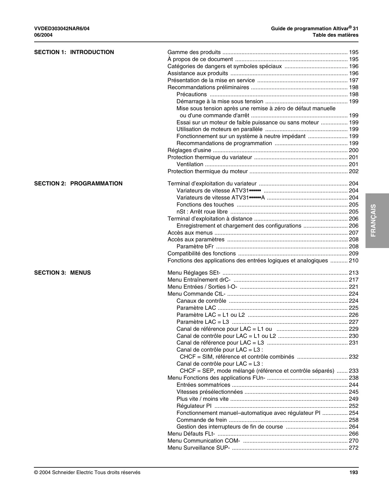 - FRANÇAIS VVDED303042NAR6/04 06/2004 Guide de programmation Altivar® 31 Table des matières Précautions p. 275