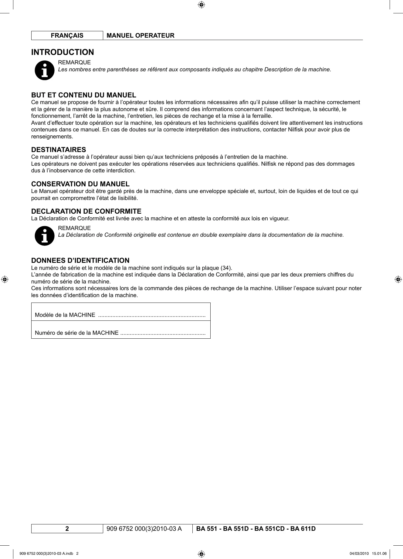 L’année de fabrication de la machine est indiquée dans la Déclaration de Conformité, ainsi que par les deux premiers chiffres du numéro de série de la machine. Ces informations sont nécessaires lors de la commande des pièces de rechange de la machine. Utiliser l’espace suivant pour noter les données d’identification de la machine. Modèle de la MACHINE Numéro de série de la MACHINE