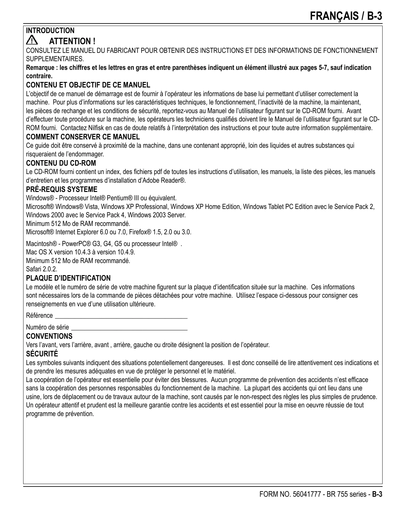 Windows® - Processeur Intel® Pentium® III ou équivalent. Microsoft® Windows® Vista, Windows XP Professional, Windows XP Home Edition, Windows Tablet PC Edition avec le Service Pack 2, Windows 2000 avec le Service Pack 4, Windows 2003 Server. Minimum 512 Mo de RAM recommandé. Microsoft® Internet Explorer 6.0 ou 7.0, Firefox® 1.5, 2.0 ou 3.0. Macintosh® - PowerPC® G3, G4, G5 ou processeur Intel® . Mac OS X version 10.4.3 à version 10.4.9. Minimum 512 Mo de RAM recommandé. Safari 2.0.2. PLAQUE D'IDENTIFICATION Le modèle et le numéro de série de votre machine figurent sur la plaque d'identification située sur la machine. Ces informations sont nécessaires lors de la commande de pièces détachées pour votre machine. Utilisez l'espace ci-dessous pour consigner ces renseignements en vue d'une utilisation ultérieure. Référence Numéro de série CONVENTIONS Vers l'avant, vers l'arrière, avant , arrière, gauche ou droite désignent la position de l'opérateur. SÉCURITÉ Les symboles suivants indiquent des situations potentiellement dangereuses. Il est donc conseillé de lire attentivement ces indications et de prendre les mesures adéquates en vue de protéger le personnel et le matériel. La coopération de l'opérateur est essentielle pour éviter des blessures. Aucun programme de prévention des accidents n'est efficace sans la coopération des personnes responsables du fonctionnement de la machine. La plupart des accidents qui ont lieu dans une usine, lors de déplacement ou de travaux autour de la machine, sont causés par le non-respect des règles les plus simples de prudence. Un opérateur attentif et prudent est la meilleure garantie contre les accidents et est essentiel pour la mise en oeuvre réussie de tout programme de prévention. FORM NO. 56041777 - BR 755 series - B-3