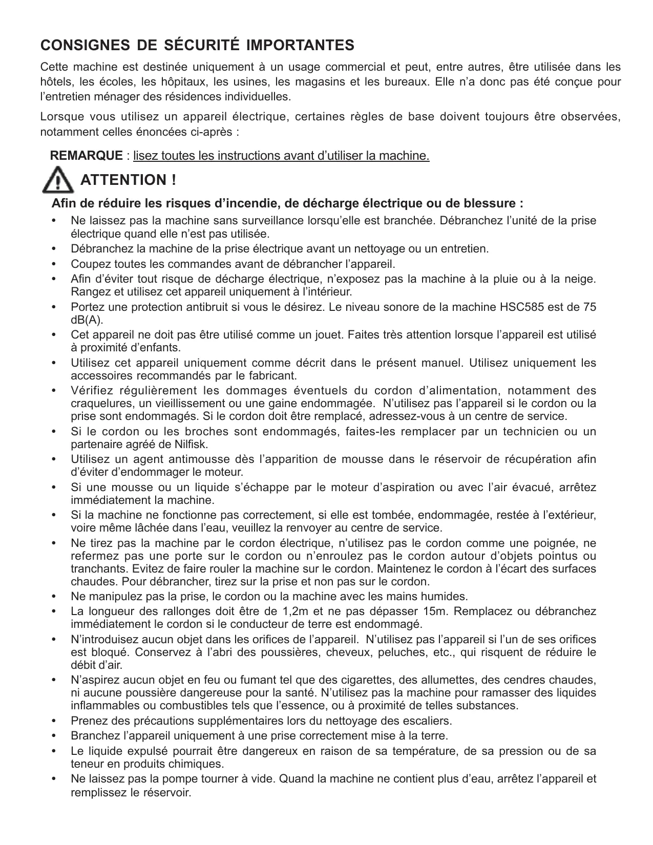 Ne laissez pas la machine sans surveillance lorsqu’elle est branchée. Débranchez l’unité de la prise électrique quand elle n’est pas utilisée. Débranchez la machine de la prise électrique avant un nettoyage ou un entretien. Coupez toutes les commandes avant de débrancher l’appareil. Afin d’éviter tout risque de décharge électrique, n’exposez pas la machine à la pluie ou à la neige. Rangez et utilisez cet appareil uniquement à l’intérieur. Portez une protection antibruit si vous le désirez. Le niveau sonore de la machine HSC585 est de 75 dB(A). Cet appareil ne doit pas être utilisé comme un jouet. Faites très attention lorsque l’appareil est utilisé à proximité d’enfants. Utilisez cet appareil uniquement comme décrit dans le présent manuel. Utilisez uniquement les accessoires recommandés par le fabricant. Vérifiez régulièrement les dommages éventuels du cordon d’alimentation, notamment des craquelures, un vieillissement ou une gaine endommagée. N’utilisez pas l’appareil si le cordon ou la prise sont endommagés. Si le cordon doit être remplacé, adressez-vous à un centre de service. Si le cordon ou les broches sont endommagés, faites-les remplacer par un technicien ou un partenaire agréé de Nilfisk. Utilisez un agent antimousse dès l’apparition de mousse dans le réservoir de récupération afin d’éviter d’endommager le moteur. Si une mousse ou un liquide s’échappe par le moteur d’aspiration ou avec l’air évacué, arrêtez immédiatement la machine. Si la machine ne fonctionne pas correctement, si elle est tombée, endommagée, restée à l’extérieur, voire même lâchée dans l’eau, veuillez la renvoyer au centre de service. Ne tirez pas la machine par le cordon électrique, n’utilisez pas le cordon comme une poignée, ne refermez pas une porte sur le cordon ou n’enroulez pas le cordon autour d’objets pointus ou tranchants. Evitez de faire rouler la machine sur le cordon. Maintenez le cordon à l’écart des surfaces chaudes. Pour débrancher, tirez sur la prise et non pas sur le cordon. Ne manipulez pas la prise, le cordon ou la machine avec les mains humides. La longueur des rallonges doit être de 1,2m et ne pas dépasser 15m. Remplacez ou débranchez immédiatement le cordon si le conducteur de terre est endommagé. N’introduisez aucun objet dans les orifices de l’appareil. N’utilisez pas l’appareil si l’un de ses orifices est bloqué. Conservez à l’abri des poussières, cheveux, peluches, etc., qui risquent de réduire le débit d’air. N’aspirez aucun objet en feu ou fumant tel que des cigarettes, des allumettes, des cendres chaudes, ni aucune poussière dangereuse pour la santé. N’utilisez pas la machine pour ramasser des liquides inflammables ou combustibles tels que l’essence, ou à proximité de telles substances. Prenez des précautions supplémentaires lors du nettoyage des escaliers. Branchez l’appareil uniquement à une prise correctement mise à la terre. Le liquide expulsé pourrait être dangereux en raison de sa température, de sa pression ou de sa teneur en produits chimiques. Ne laissez pas la pompe tourner à vide. Quand la machine ne contient plus d’eau, arrêtez l’appareil et remplissez le réservoir.