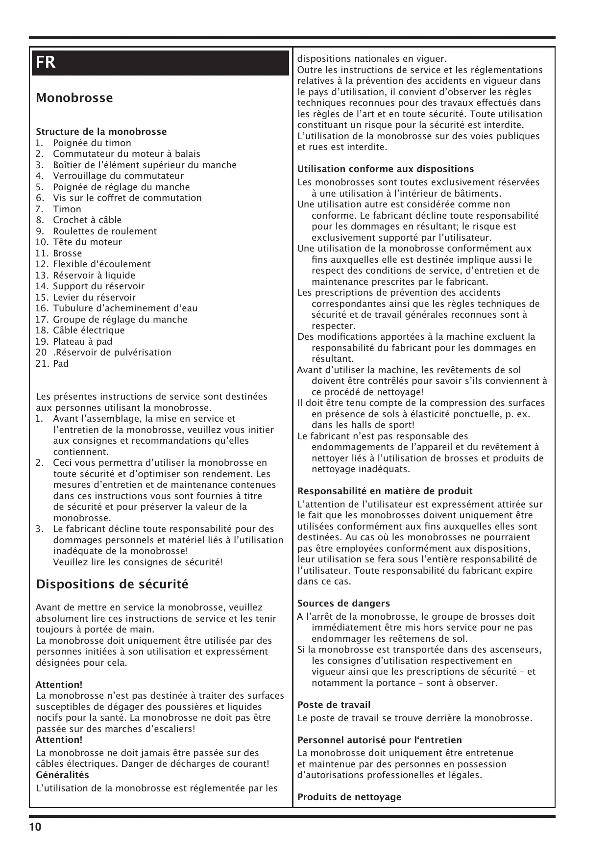 2. Commutateur du moteur à balais 3. Boîtier de lʼélément supérieur du manche 4. Verrouillage du commutateur 5. Poignée de réglage du manche 6. Vis sur le coffret de commutation 7. Timon 8. Crochet à câble 9. Roulettes de roulement 10. Tête du moteur 11. Brosse 12. Flexible dʻécoulement 13. Réservoir à liquide 14. Support du réservoir 15. Levier du réservoir 16. Tubulure dʼacheminement dʻeau 17. Groupe de réglage du manche 18. Câble électrique 19. Plateau à pad 20 .Réservoir de pulvérisation 21. Pad Les présentes instructions de service sont destinées aux personnes utilisant la monobrosse. 1. Avant lʼassemblage, la mise en service et lʼentretien de la monobrosse, veuillez vous initier aux consignes et recommandations quʼelles contiennent. 2. Ceci vous permettra dʼutiliser la monobrosse en toute sécurité et dʼoptimiser son rendement. Les mesures dʼentretien et de maintenance contenues dans ces instructions vous sont fournies à titre de sécurité et pour préserver la valeur de la monobrosse. 3. Le fabricant décline toute responsabilité pour des dommages personnels et matériel liés à lʼutilisation inadéquate de la monobrosse! Veuillez lire les consignes de sécurité!
