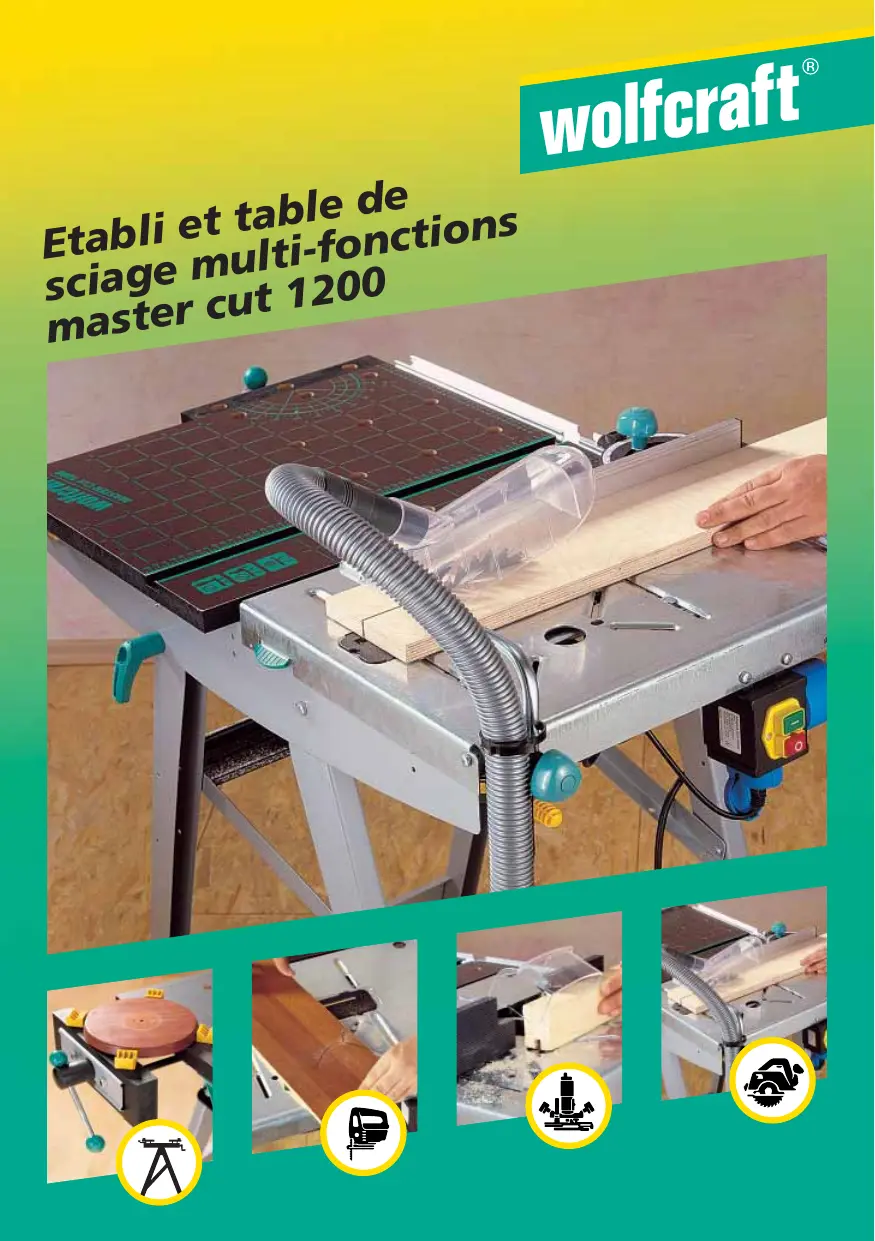 Rail de guide parallèle déployé sur toute la longueur de la table pour des coupes larges. Réf. 6165 100 Cette solution compacte et fonctionnelle unit les avantages d’une table pour machine avec ceux d’un établi d’usage universel. Le master cut 1200 s’utilise comme table de sciage ou de fraisage, pour un travail sûr et précis, ou comme établi robuste, qui vous convaincra par ses fonctions et son équipement. Facilité montage des appareils par bascule du plateau. Butée d‘onglet coulissant dans la rainure du plateau bois pour des coupes précises en angle réglables de 0 à 60°. Débord de 4 cm du plateau bois qui permet d‘adapter des outils tels que serrejoints, support de perceuse. Utilisation comme table de sciage et de fraisage :