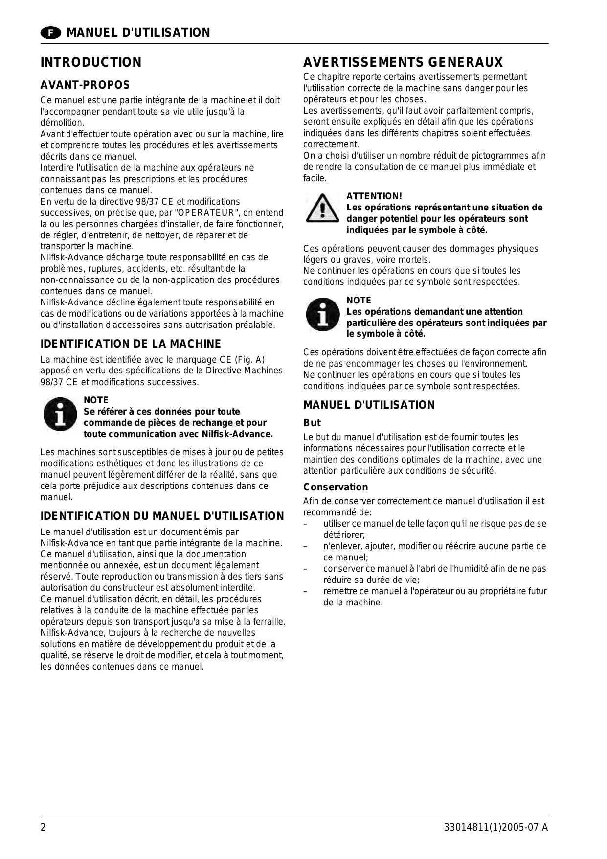 98/37 CE et modifications successives. NOTE Se référer à ces données pour toute commande de pièces de rechange et pour toute communication avec Nilfisk-Advance. Les machines sont susceptibles de mises à jour ou de petites modifications esthétiques et donc les illustrations de ce manuel peuvent légèrement différer de la réalité, sans que cela porte préjudice aux descriptions contenues dans ce manuel.