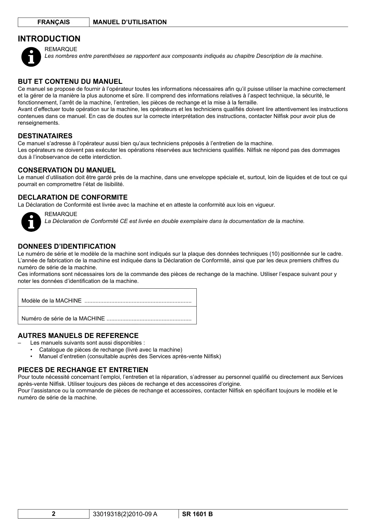 2 33019318(2)2010-09 A SR 1601 B MANUEL D'UTILISATION FRANÇAIS MODIFICATIONS ET AMELIORATIONS Nilfisk vise à un constant perfectionnement de ses produits et se réserve le droit d'effectuer des modifications et des améliorations lorsqu'elle le considère nécessaire sans l'obligation de modifier les machines précédemment vendues.