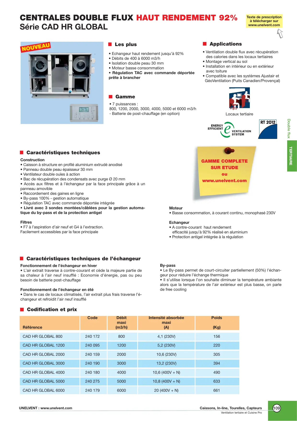 CENTRALE DOUBLE FLUX CAD HR GLOBAL - Système de ventilation UNELVENT - Notice d'utilisation et mode d'emploi gratuit