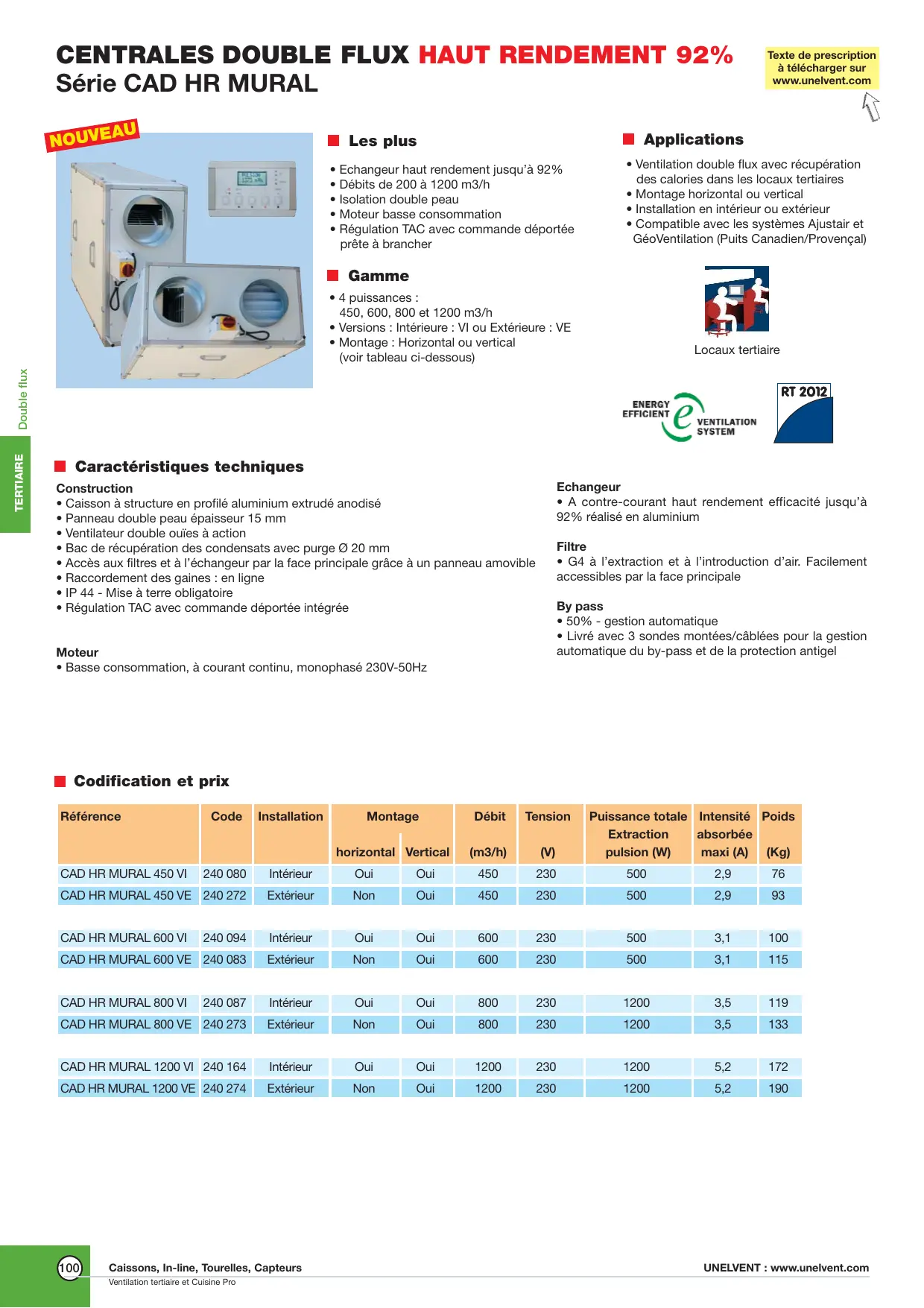 | CAD HR MURAL 1200 VE | 240 274 | Extérieur | Non | Oui | 1200 | 230 | 1200 | 5,2 | 190 |