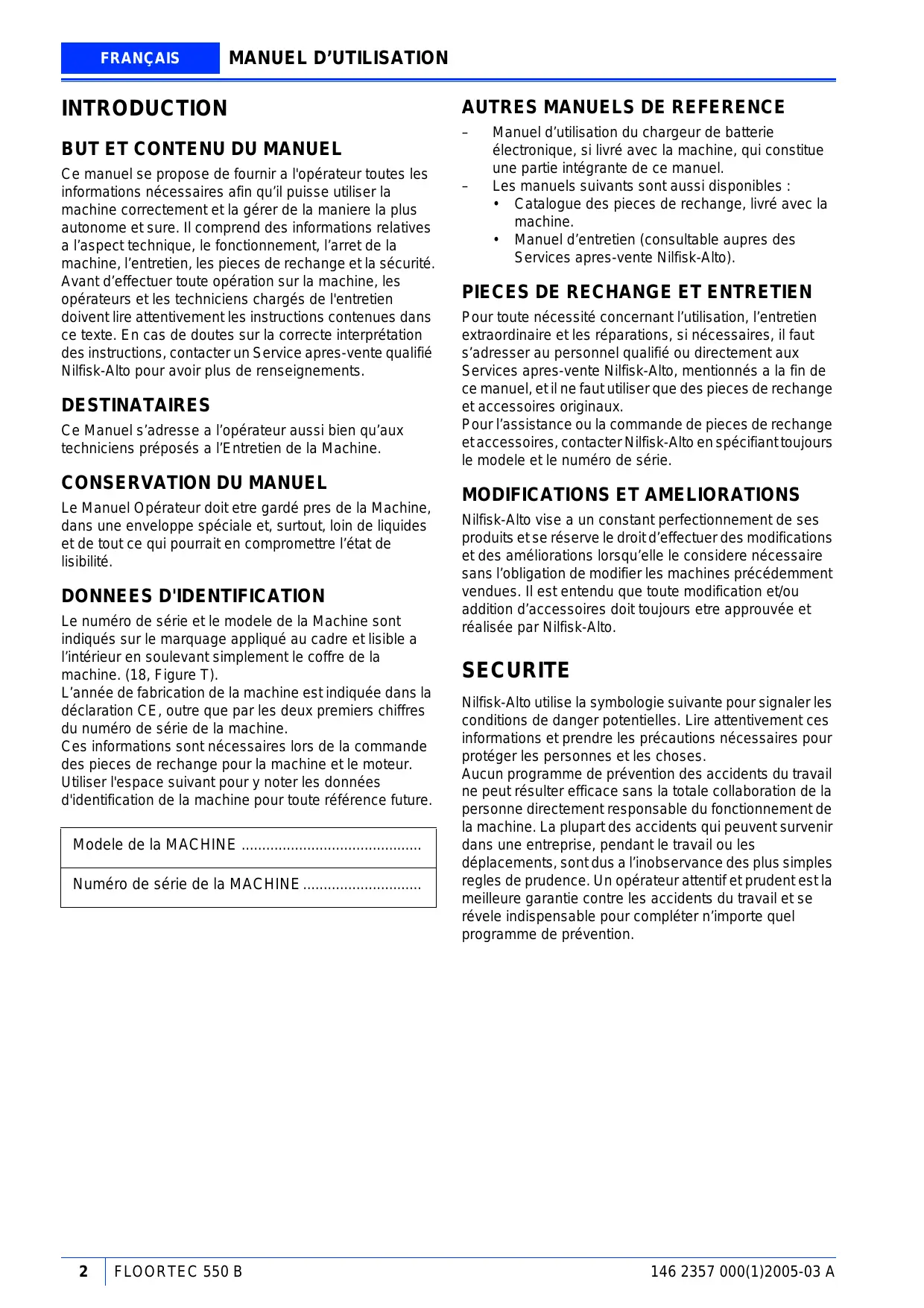 BUT ET CONTENU DU MANUEL Ce manuel se propose de fournir a l'opérateur toutes les informations nécessaires afin qu’il puisse utiliser la machine correctement et la gérer de la maniere la plus autonome et sure. Il comprend des informations relatives a l’aspect technique, le fonctionnement, l’arret de la machine, l’entretien, les pieces de rechange et la sécurité. Avant d’effectuer toute opération sur la machine, les opérateurs et les techniciens chargés de l'entretien doivent lire attentivement les instructions contenues dans ce texte. En cas de doutes sur la correcte interprétation des instructions, contacter un Service apres-vente qualifié Nilfisk-Alto pour avoir plus de renseignements.