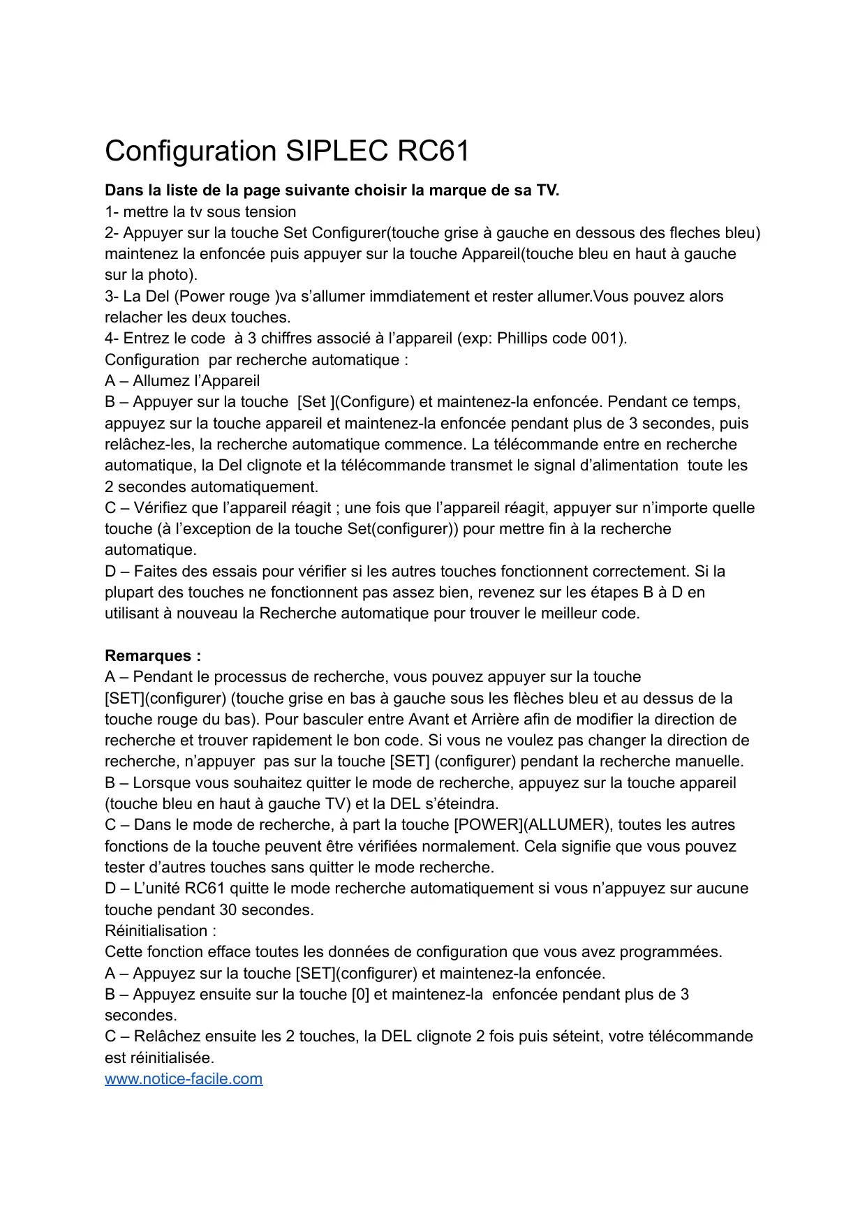 Retrouvez gratuitement la notice de l'appareil RC61 SIPLEC au format PDF.