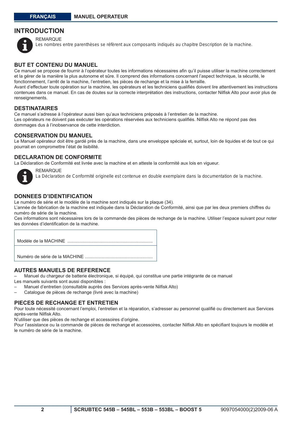 Modèle de la MACHINE Numéro de série de la MACHINE AUTRES MANUELS DE REFERENCE – Manuel du chargeur de batterie électronique, si équipé, qui constitue une partie intégrante de ce manuel Les manuels suivants sont aussi disponibles : – Manuel d’entretien (consultable auprès des Services après-vente Nilfisk Alto) – Catalogue de pièces de rechange (livré avec la machine)