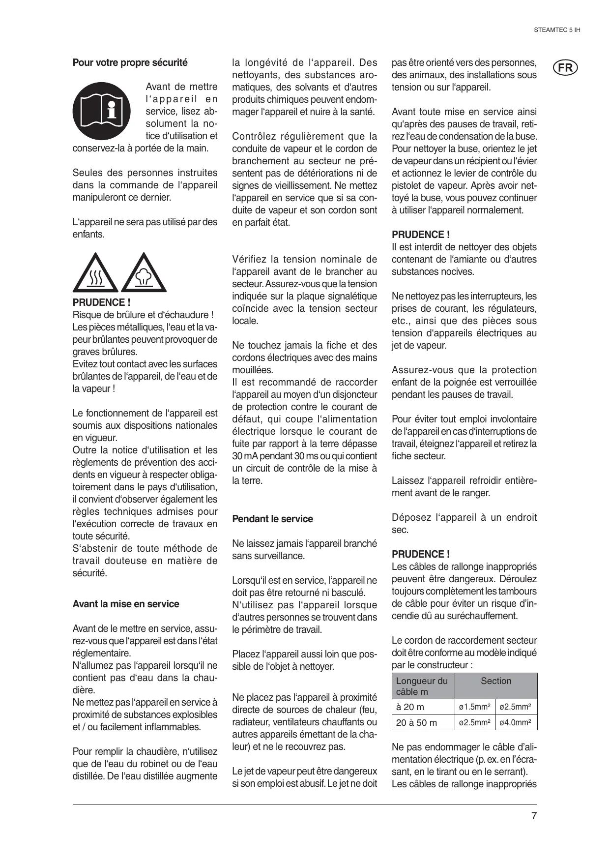 Avant toute mise en service ainsi qu‘après des pauses de travail, retirez l‘eau de condensation de la buse. Pour nettoyer la buse, orientez le jet de vapeur dans un récipient ou l‘évier et actionnez le levier de contrôle du pistolet de vapeur. Après avoir nettoyé la buse, vous pouvez continuer à utiliser l‘appareil normalement. PRUDENCE ! Il est interdit de nettoyer des objets contenant de l‘amiante ou d‘autres substances nocives. Ne nettoyez pas les interrupteurs, les prises de courant, les régulateurs, etc., ainsi que des pièces sous tension d‘appareils électriques au jet de vapeur. Assurez-vous que la protection enfant de la poignée est verrouillée pendant les pauses de travail. Pour éviter tout emploi involontaire de l‘appareil en cas d‘interruptions de travail, éteignez l‘appareil et retirez la fiche secteur. Laissez l‘appareil refroidir entièrement avant de le ranger. Déposez l‘appareil à un endroit sec. PRUDENCE ! Les câbles de rallonge inappropriés peuvent être dangereux. Déroulez toujours complètement les tambours de câble pour éviter un risque d’incendie dû au suréchauffement. Le cordon de raccordement secteur doit être conforme au modèle indiqué par le constructeur : Longueur du câble m