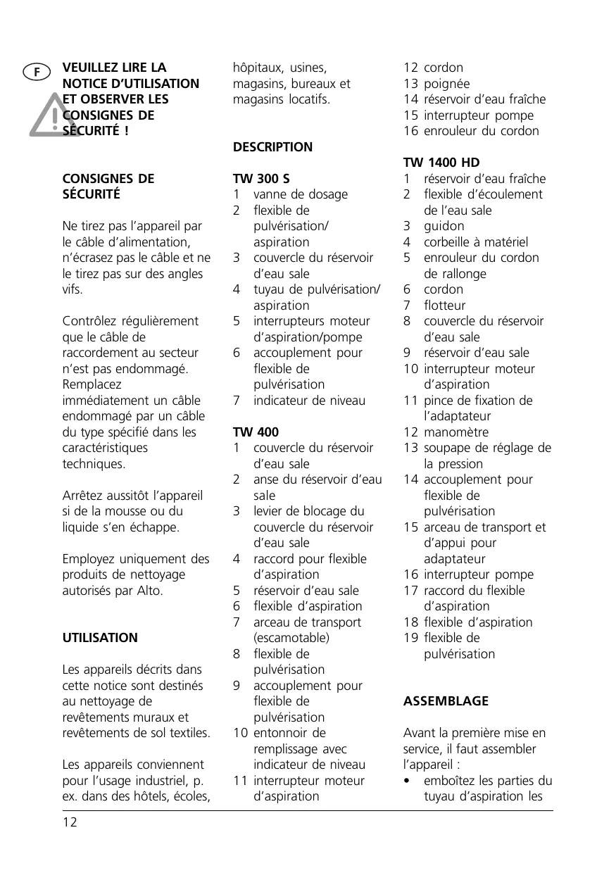 TW 300 S 1 vanne de dosage 2 flexible de pulvérisation/ aspiration 3 couvercle du réservoir d’eau sale 4 tuyau de pulvérisation/ aspiration 5 interrupteurs moteur d’aspiration/pompe 6 accouplement pour flexible de pulvérisation 7 indicateur de niveau TW 400 1 couvercle du réservoir d’eau sale 2 anse du réservoir d’eau sale 3 levier de blocage du couvercle du réservoir d’eau sale 4 raccord pour flexible d’aspiration 5 réservoir d’eau sale 6 flexible d’aspiration 7 arceau de transport (escamotable) 8 flexible de pulvérisation 9 accouplement pour flexible de pulvérisation 10 entonnoir de remplissage avec indicateur de niveau 11 interrupteur moteur d’aspiration TW 1400 HD 1 réservoir d’eau fraîche 2 flexible d’écoulement de l’eau sale 3 guidon 4 corbeille à matériel 5 enrouleur du cordon de rallonge 6 cordon 7 flotteur 8 couvercle du réservoir d’eau sale 9 réservoir d’eau sale 10 interrupteur moteur d’aspiration 11 pince de fixation de l’adaptateur 12 manomètre 13 soupape de réglage de la pression 14 accouplement pour flexible de pulvérisation 15 arceau de transport et d’appui pour adaptateur 16 interrupteur pompe 17 raccord du flexible d’aspiration 18 flexible d’aspiration 19 flexible de pulvérisation ASSEMBLAGE Avant la première mise en service, il faut assembler l’appareil :