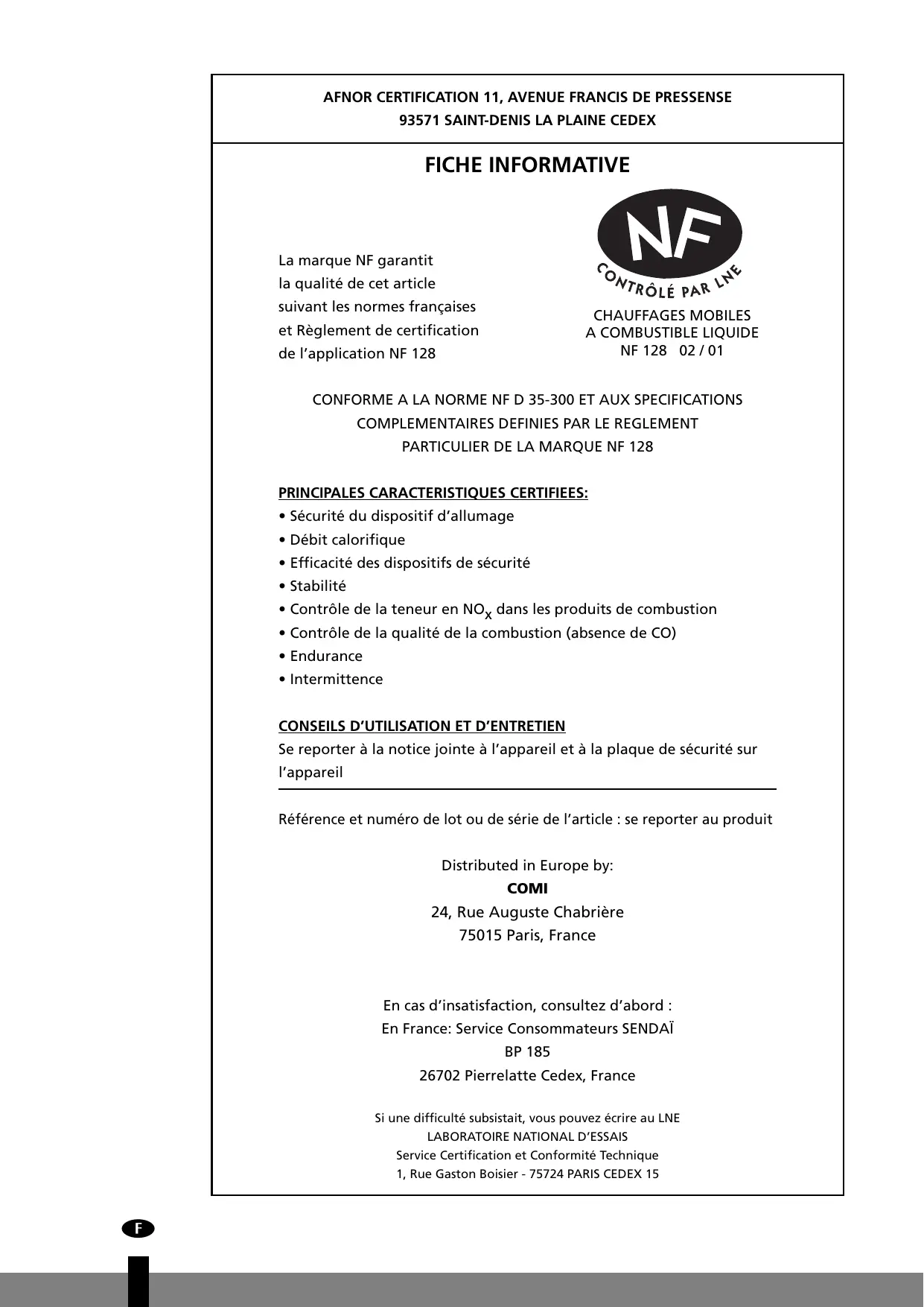 Se reporter à la notice jointe au convecteur et aux indications figurant sur l’emballage de la mèche. Référence et numéro de lot ou de série de l’article : se reporter au produit Distributed in Europe by: COMI 24, Rue Auguste Chabrière 75015 Paris, France En cas d’insatisfaction, consultez d’abord : En France: Service Consommateurs SENDAÏ BP 185 26702 Pierrelatte Cedex, France Si une difficulté subsistait, vous pouvez écrire au LNE